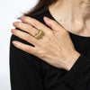 Metal & Hallmark: 18 karat & 14 karat yellow gold. The ring is hallmarked "14k". The ribbed dome has tested ppositive for 18k gold.