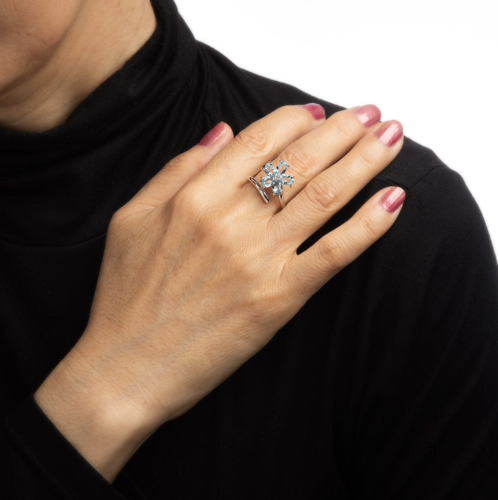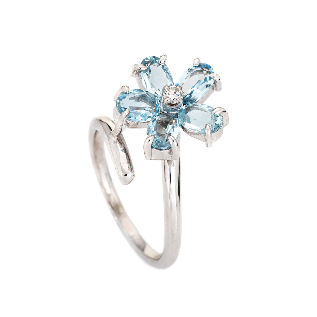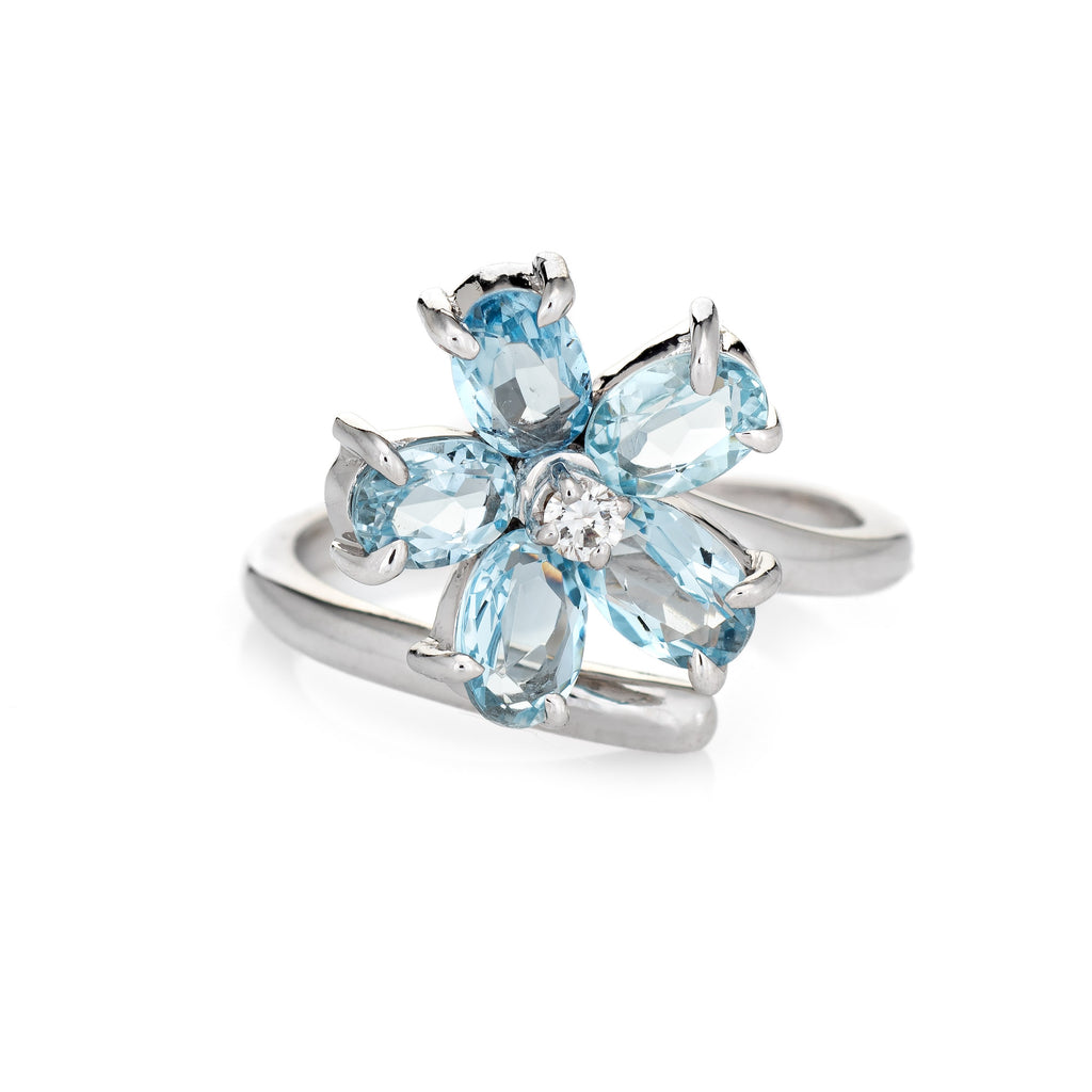 The clear-as-sky-blue aquamarines are set into a five petal floral design, a pretty setting with a nice pop of color for the spring and summer season. The medium rise ring (9.5mm - 0.37 inches) sits comfortably on the finger.