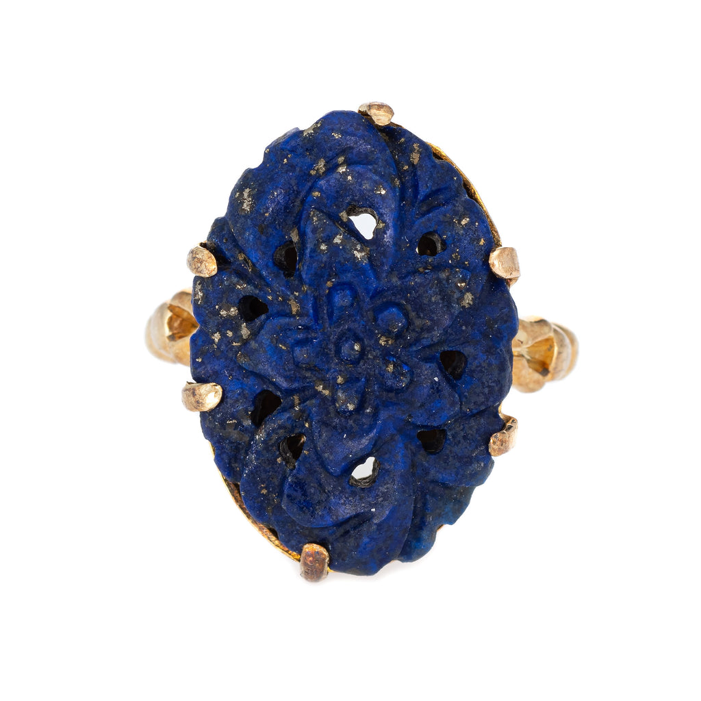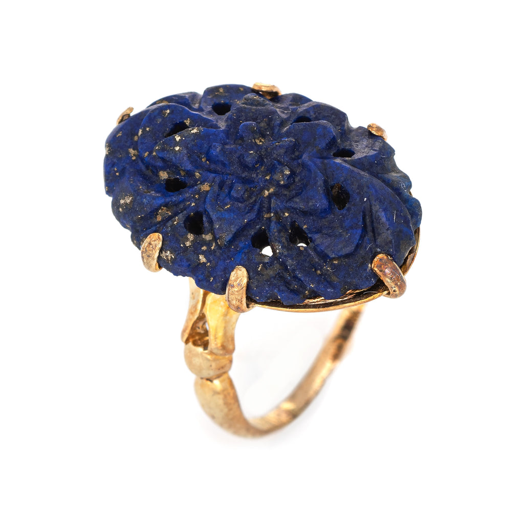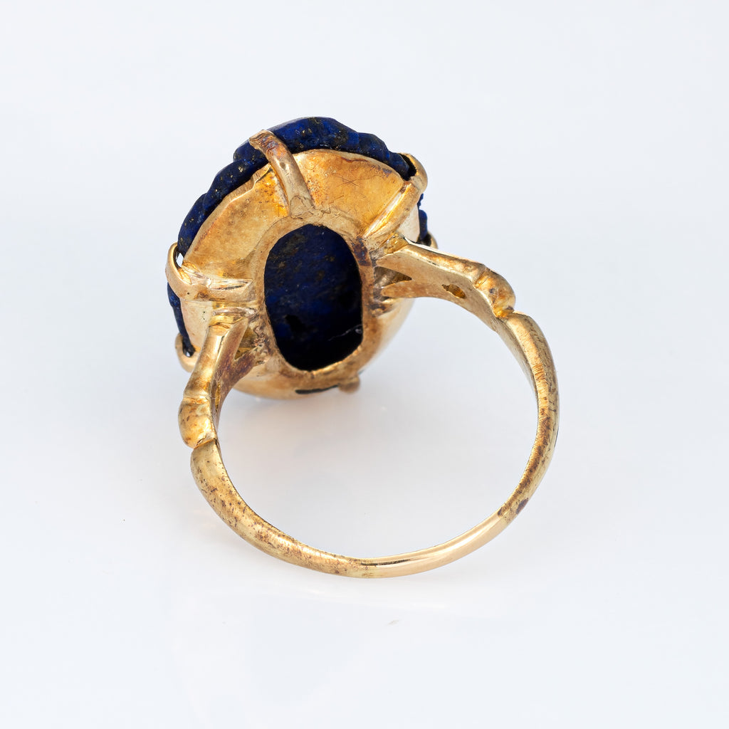 Stylish vintage carved lapis lazuli cocktail ring (circa 1950s to 1960s) crafted in 14 karat yellow gold.