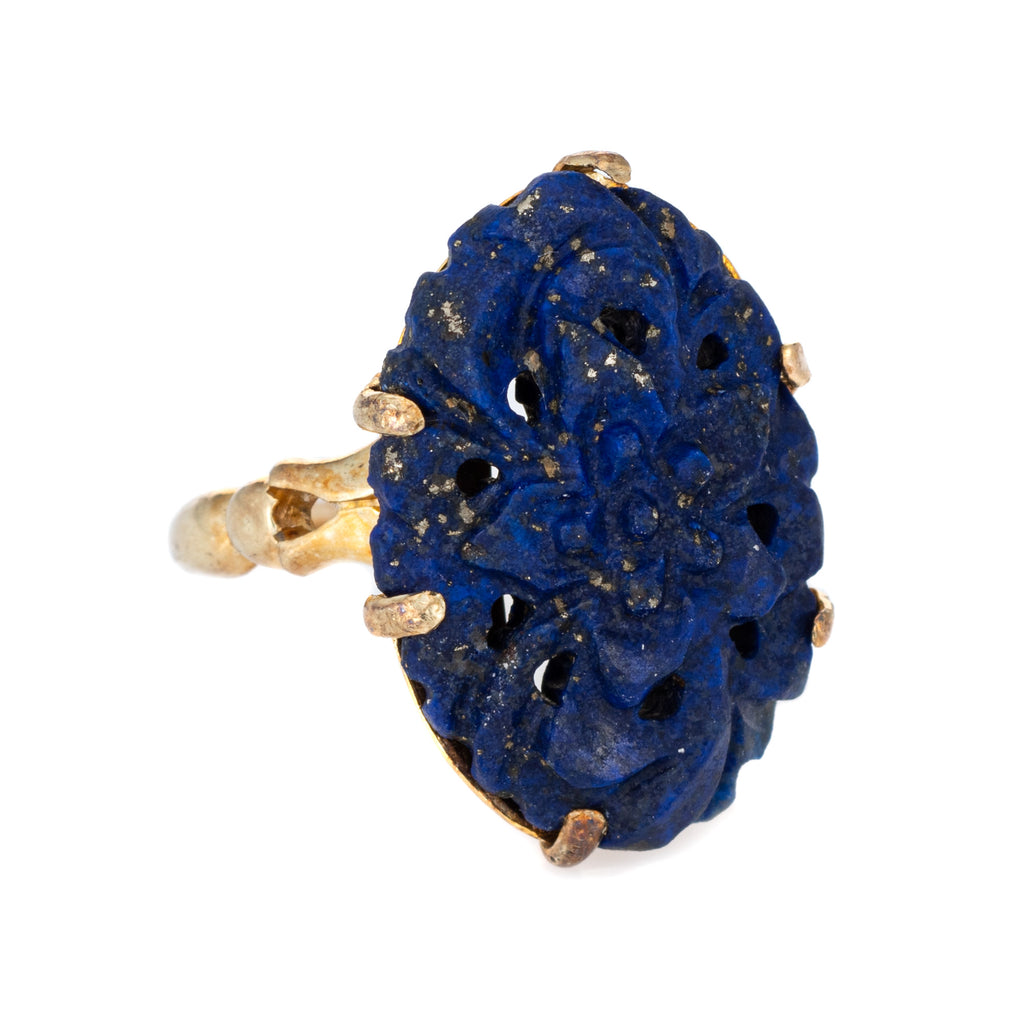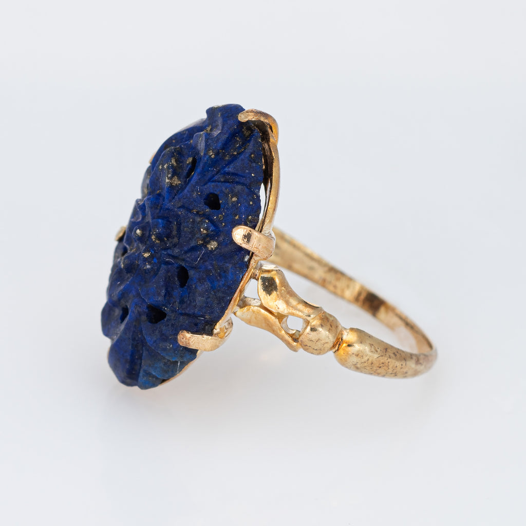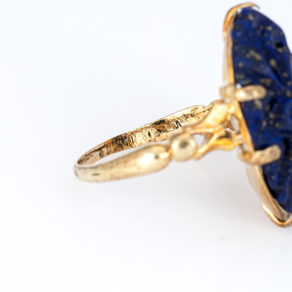 Stylish vintage carved lapis lazuli cocktail ring (circa 1950s to 1960s) crafted in 14 karat yellow gold.
