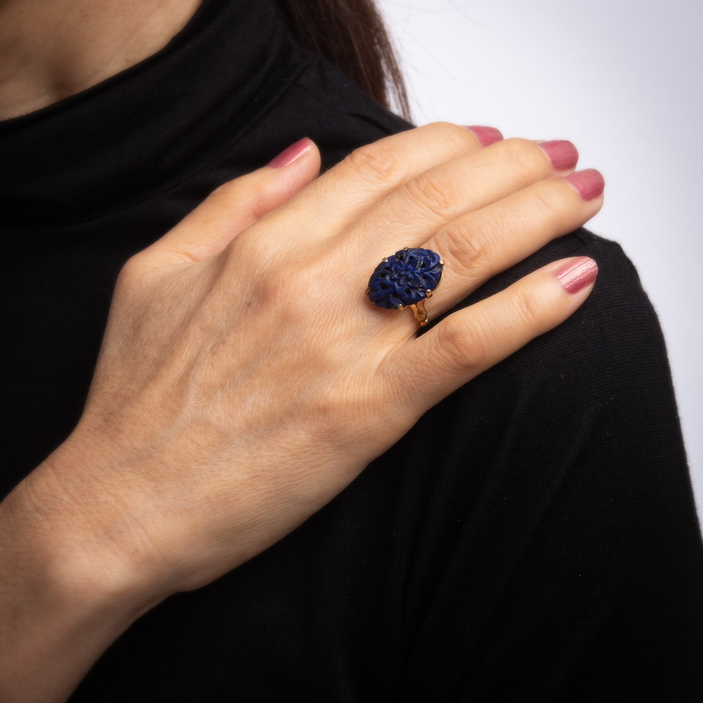 The cobalt blue lapis is carved in the form of a flower. The statement ring adds a nice pop of color on the hand. The low rise ring (6mm - 0.23 inches) sits comfortably on the finger. The colorful ring is impactful in design and ideal worn day or night.