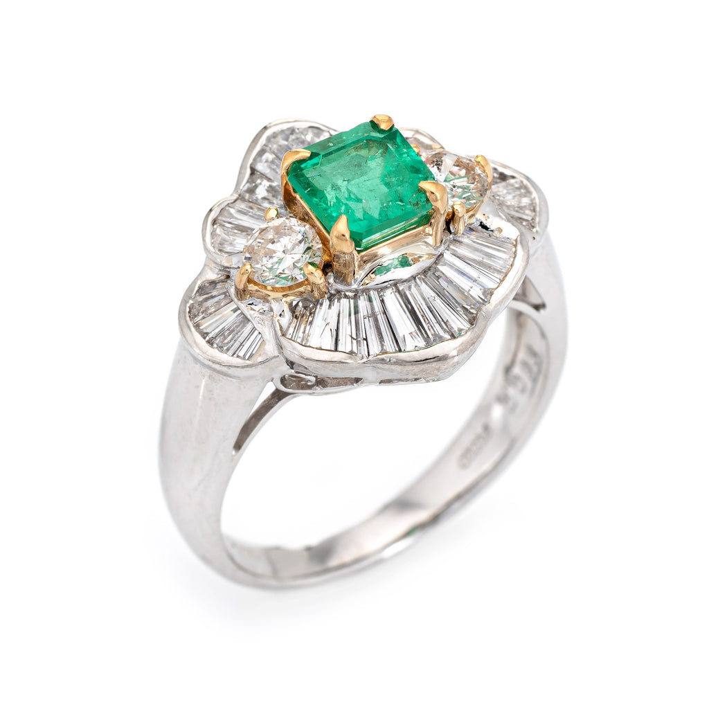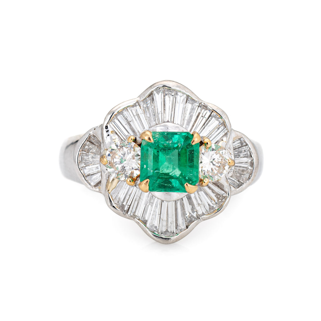 Stones: Emerald cut emerald measures 6mm (0.98 carats), accented with 1.20 carats of diamonds (estimated at H-I color and VS2-I1 clarity). The emerald is in excellent condition and free of cracks or chips.