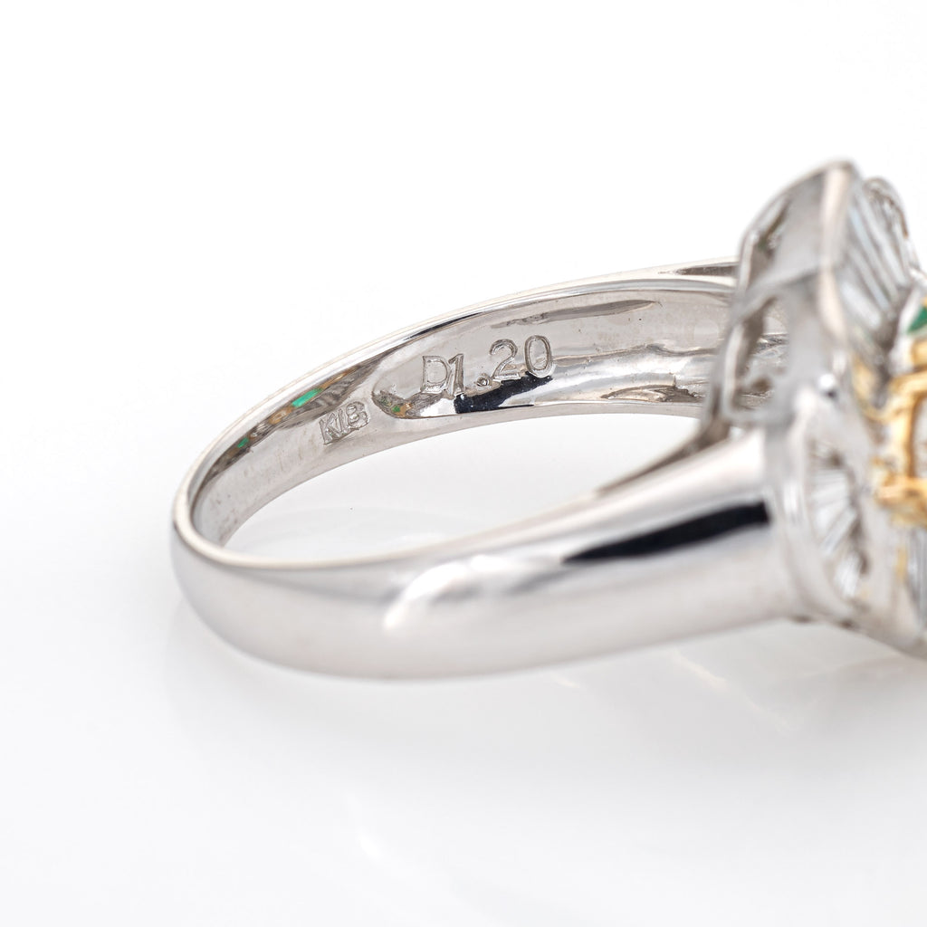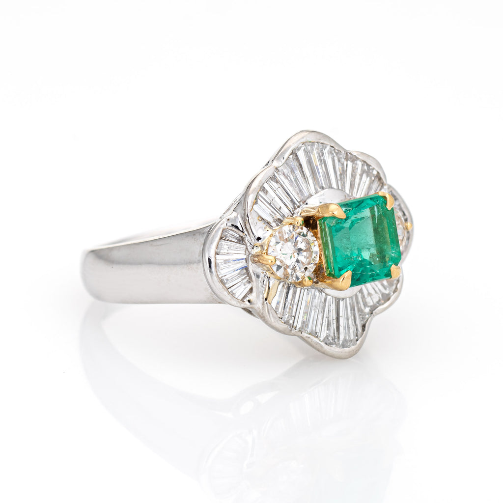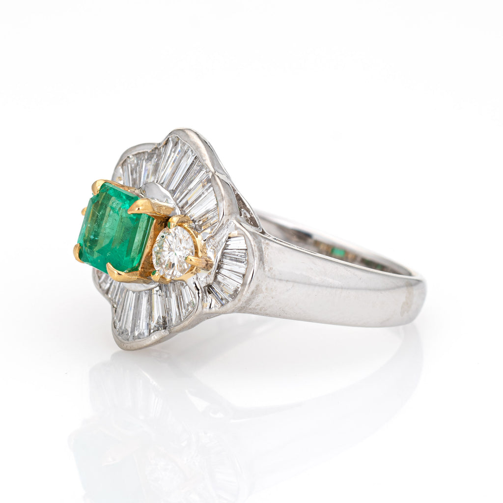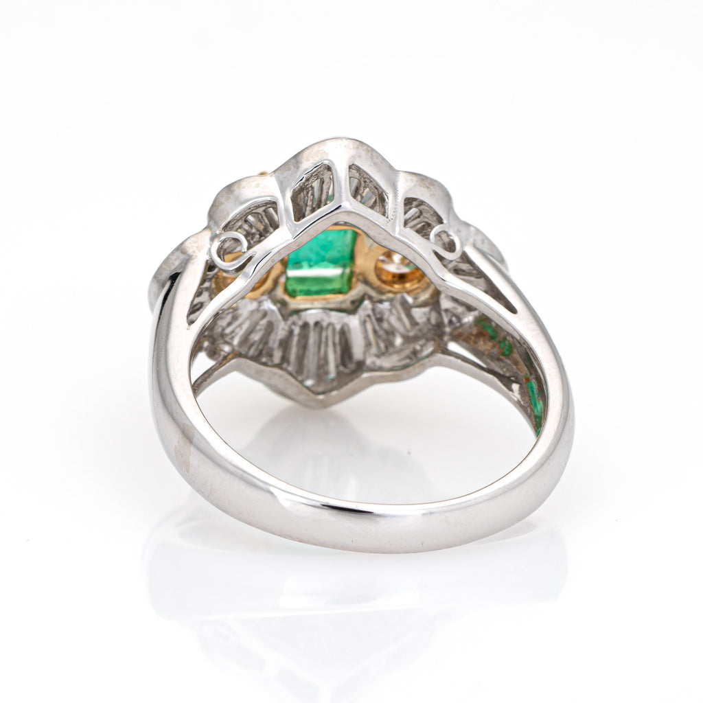 Stylish emerald & diamond cocktail ring crafted in platinum & 18 karat yellow gold.