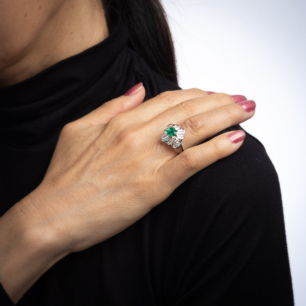 The vibrant green emerald is accented with mixed cut diamonds (marquise & round brilliant cut) in a ballerina style mount. The diamonds shimmer with every movement of the ring & the cocktail ring makes a great statement on the hand. The medium rise ring (9mm - 0.35 inches) sits comfortably on the finger.