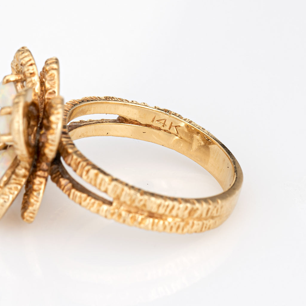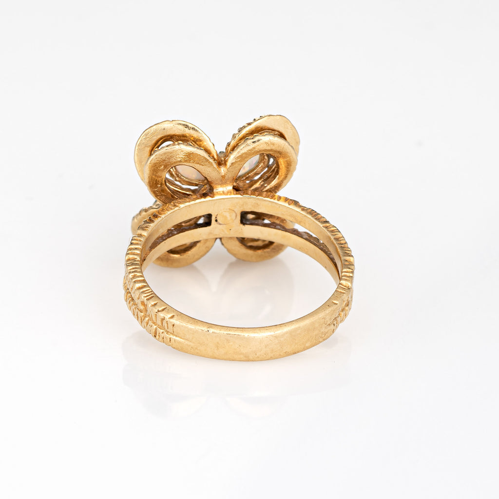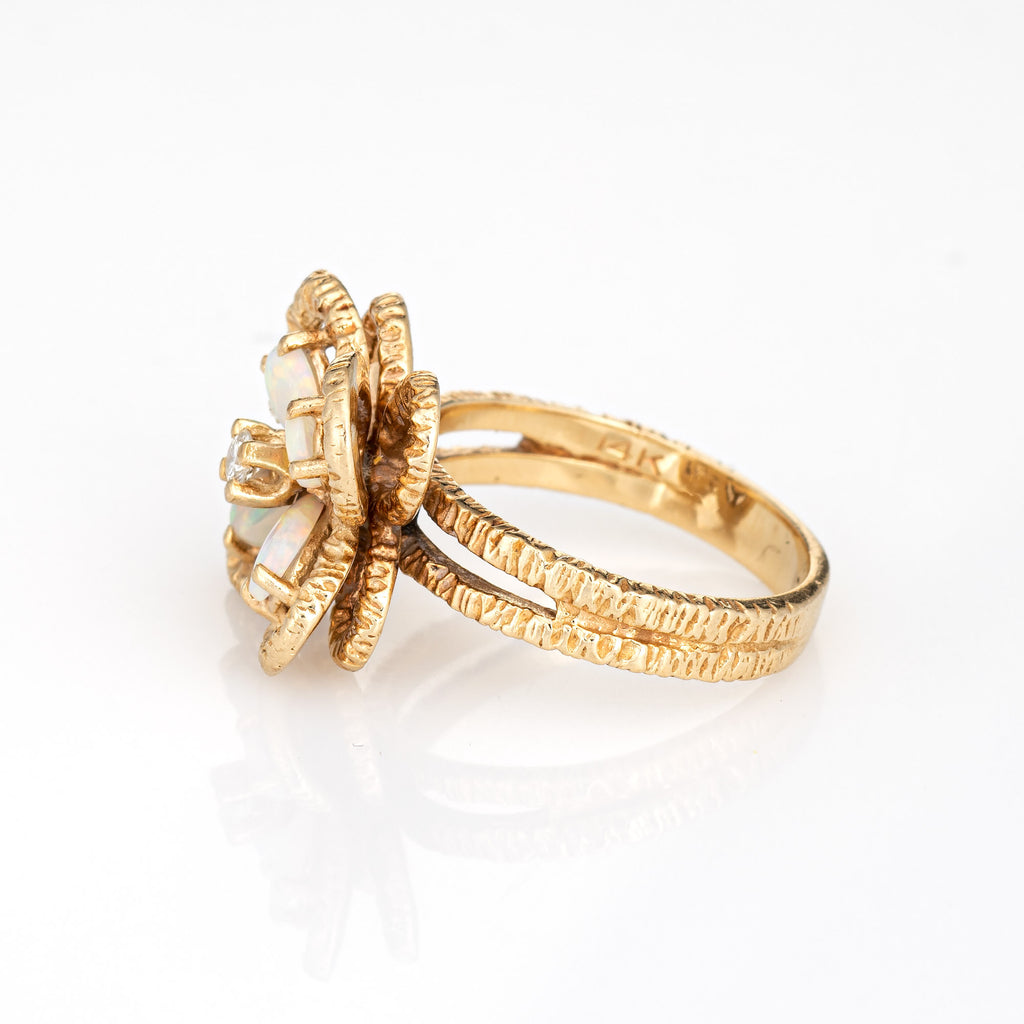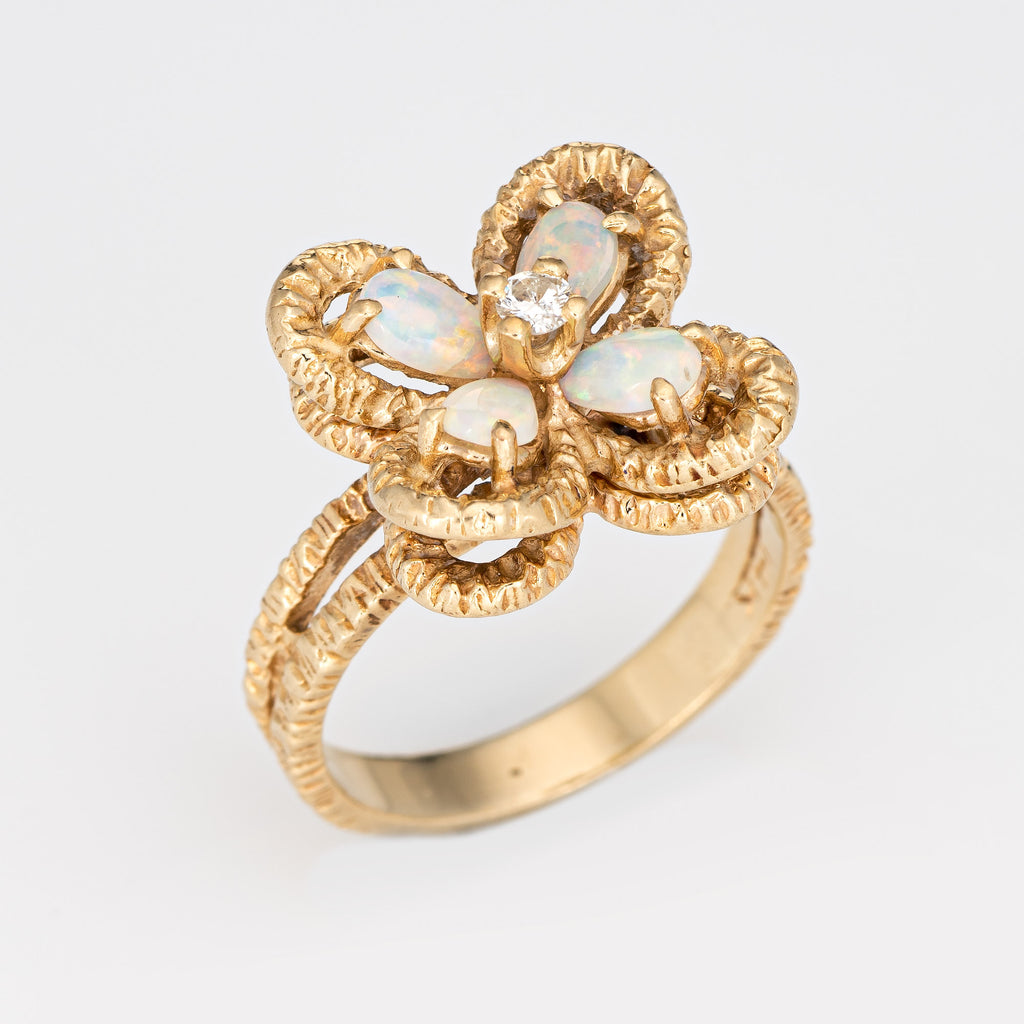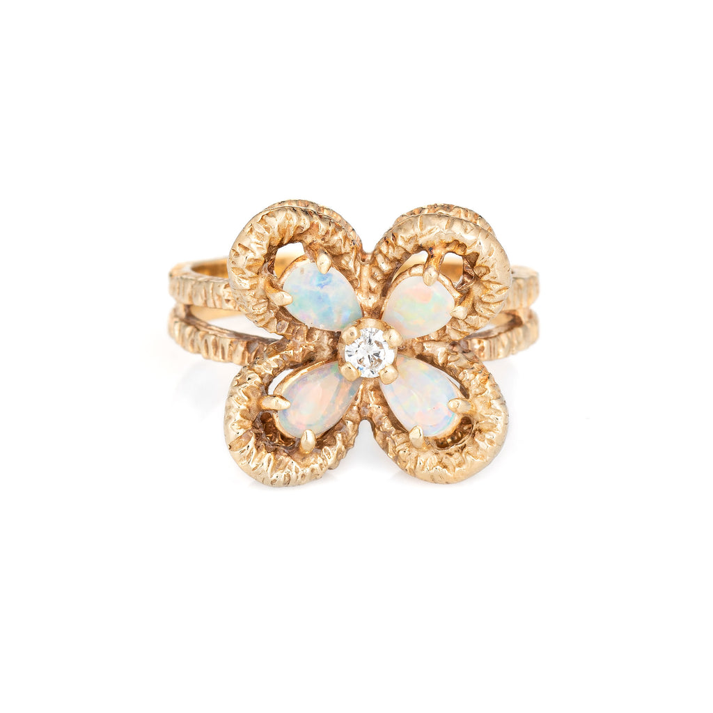 Stylish vintage opal & diamond four leaf clover ring crafted in 14 karat yellow gold (circa 1960s to 1970s).