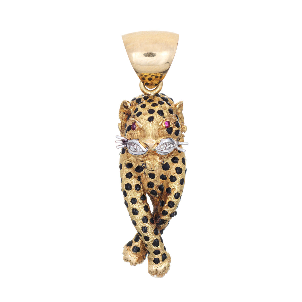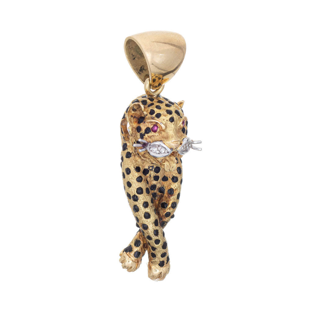 The charming & whimsical leopard sits perched in a fierce pose with legs crossed. The wide bale measures 6mm and can accommodate a thick chain if desired. Black enameled spots give lifelike detail to the pendant. The matching earrings are also available for sale.