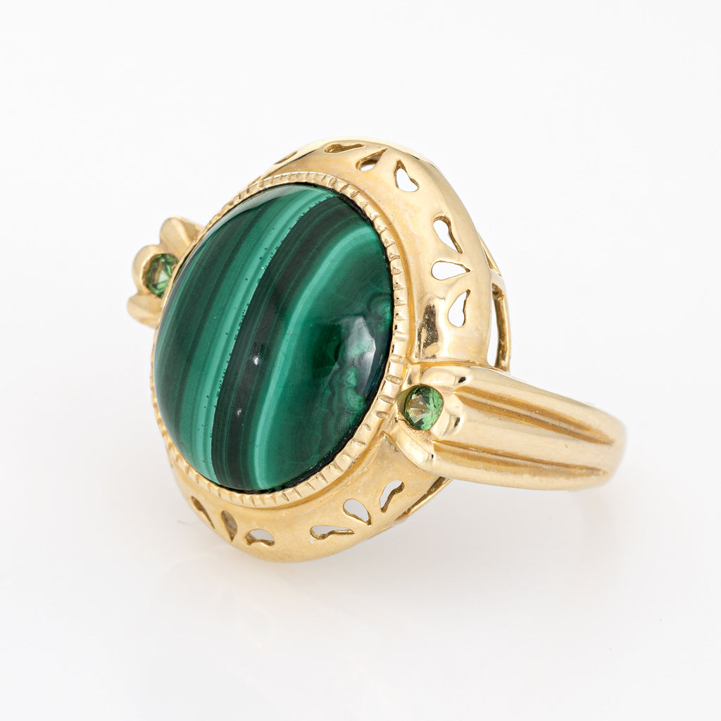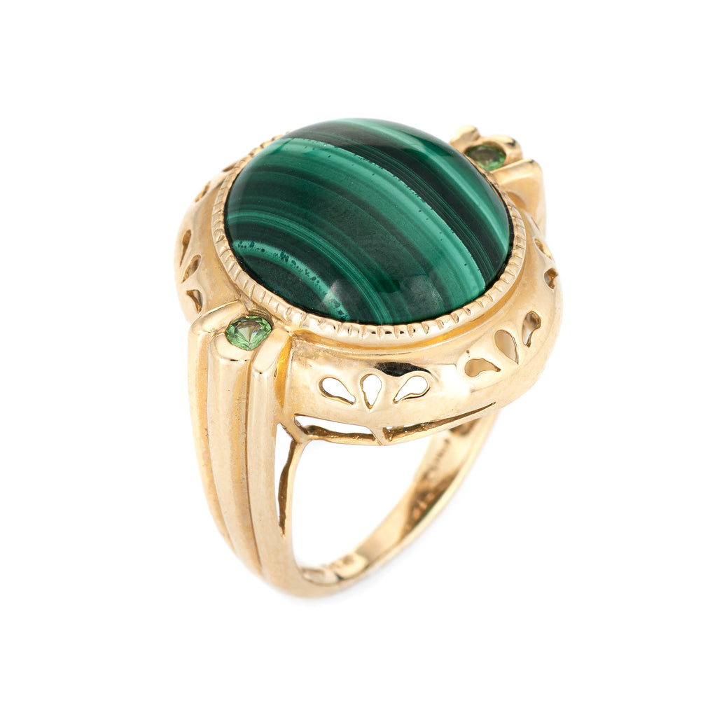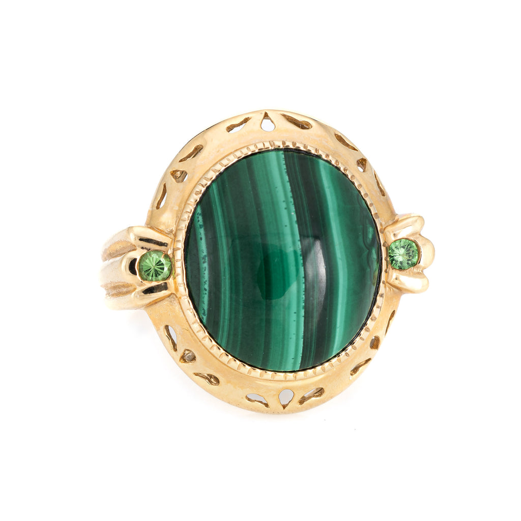 Stylish estate malachite & peridot cocktail ring crafted in 14 karat yellow gold.