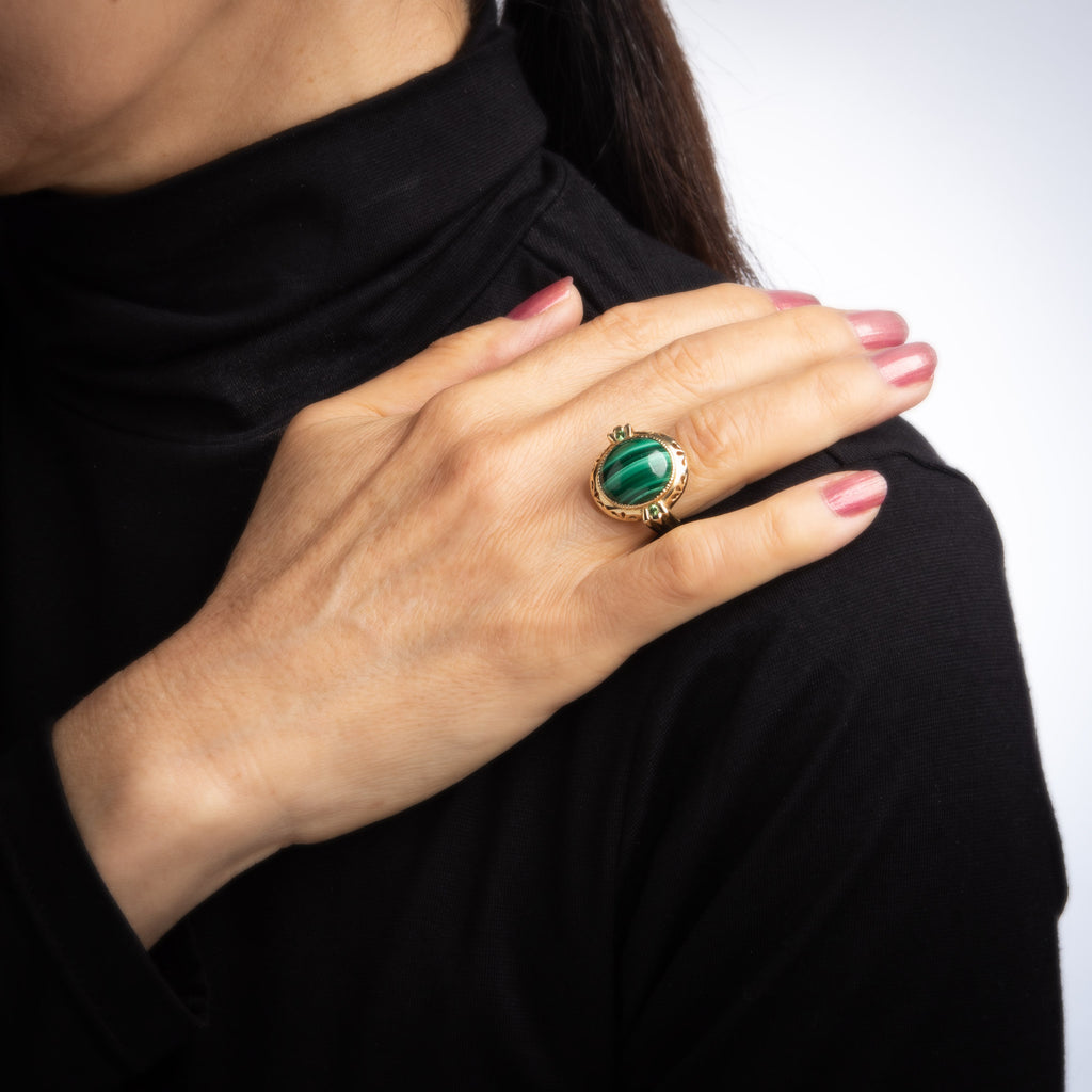 The banded malachite features dark green to light green hues, bordered with peridot to the side shoulders. The cocktail ring makes a nice statement on the hand. The medium rise ring (8.5mm - 0.33 inches) sits comfortably on the finger.