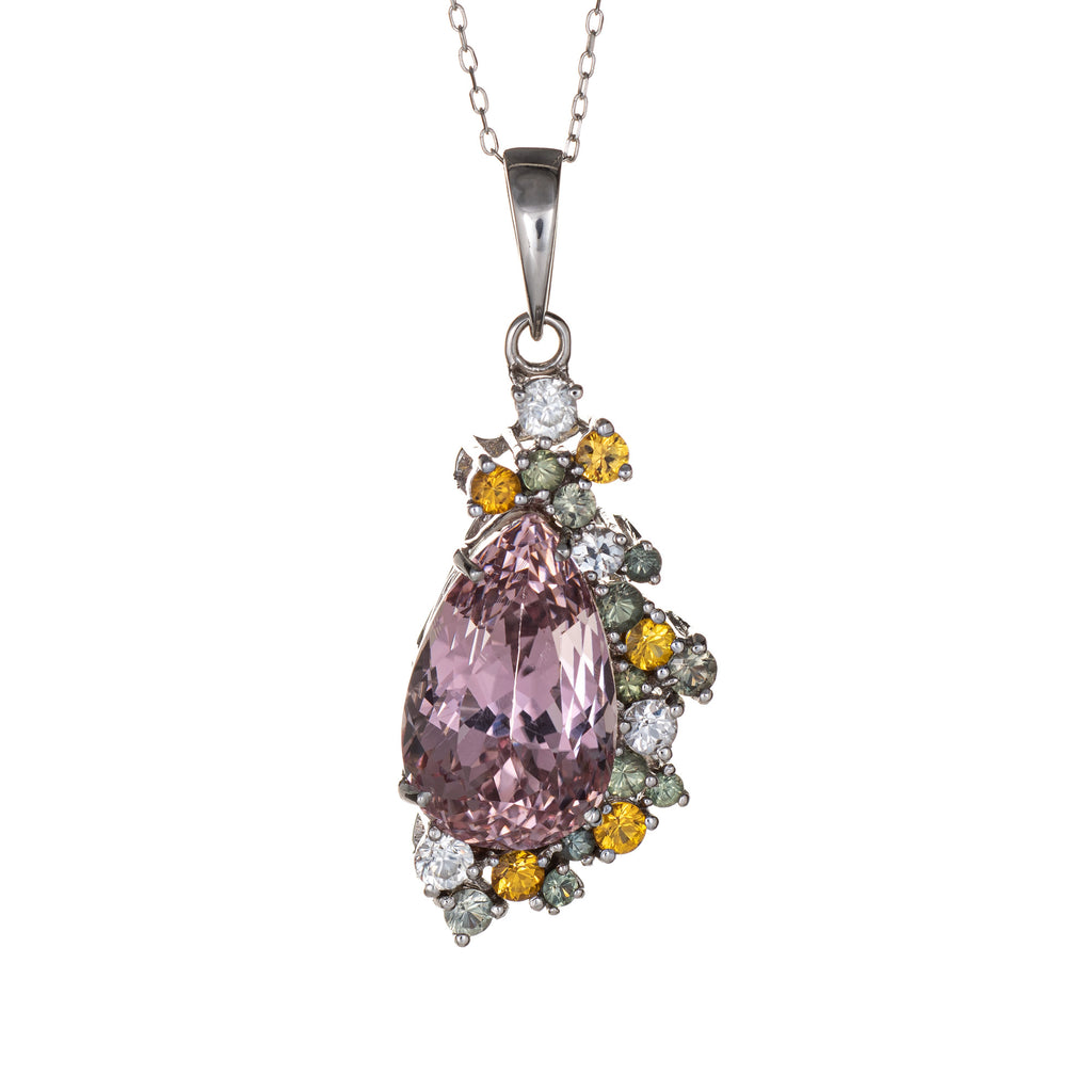 Finely detailed morganite & multi gemstone necklace crafted in 14 karat white gold.