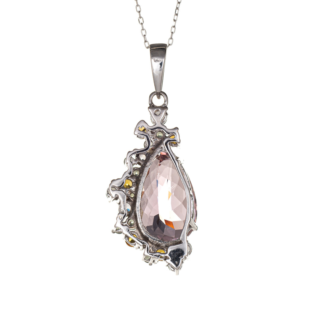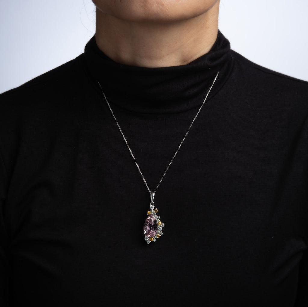 Stones: Pear cut faceted morganite measures 20mm x 12mm (estimated at 11 carats). Citrine, prasiolite and white topaz total an estimated 2.25 carats. The stones are in excellent condition and free of cracks or chips.