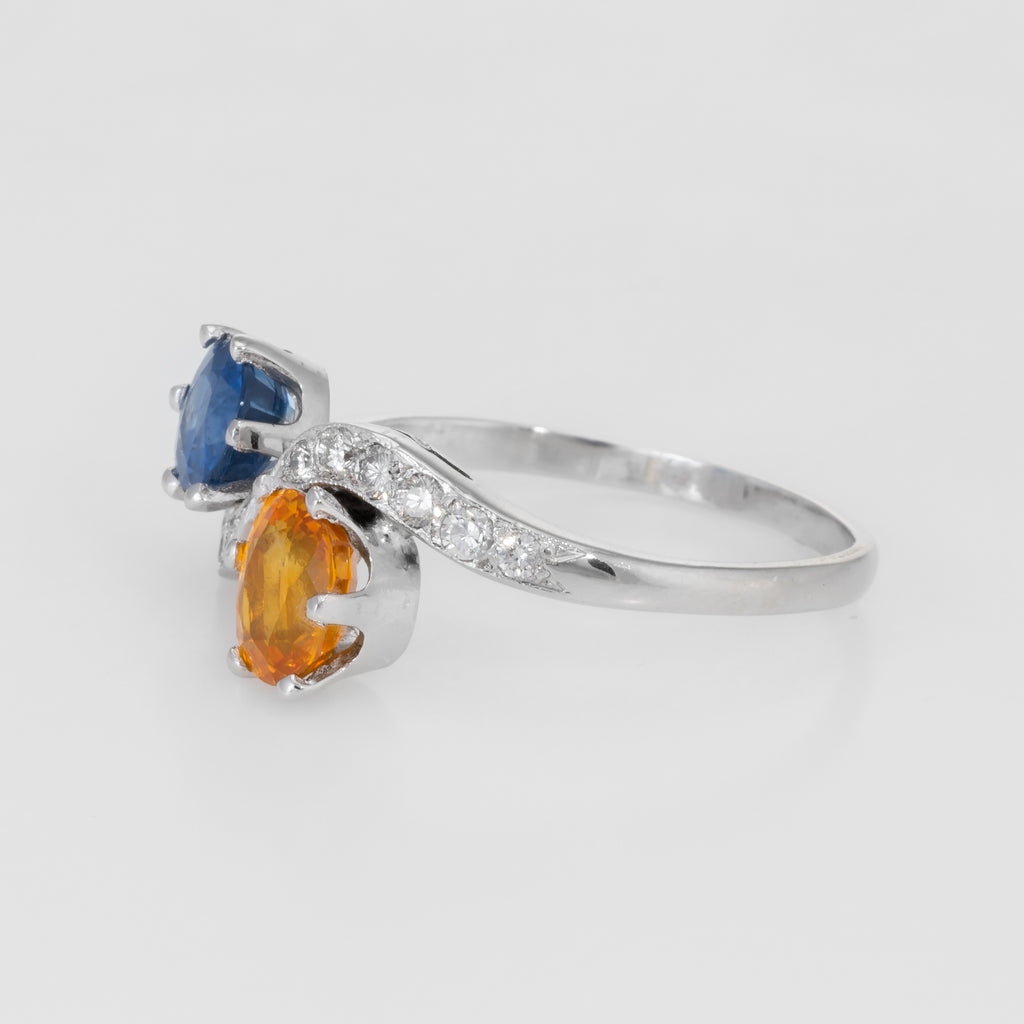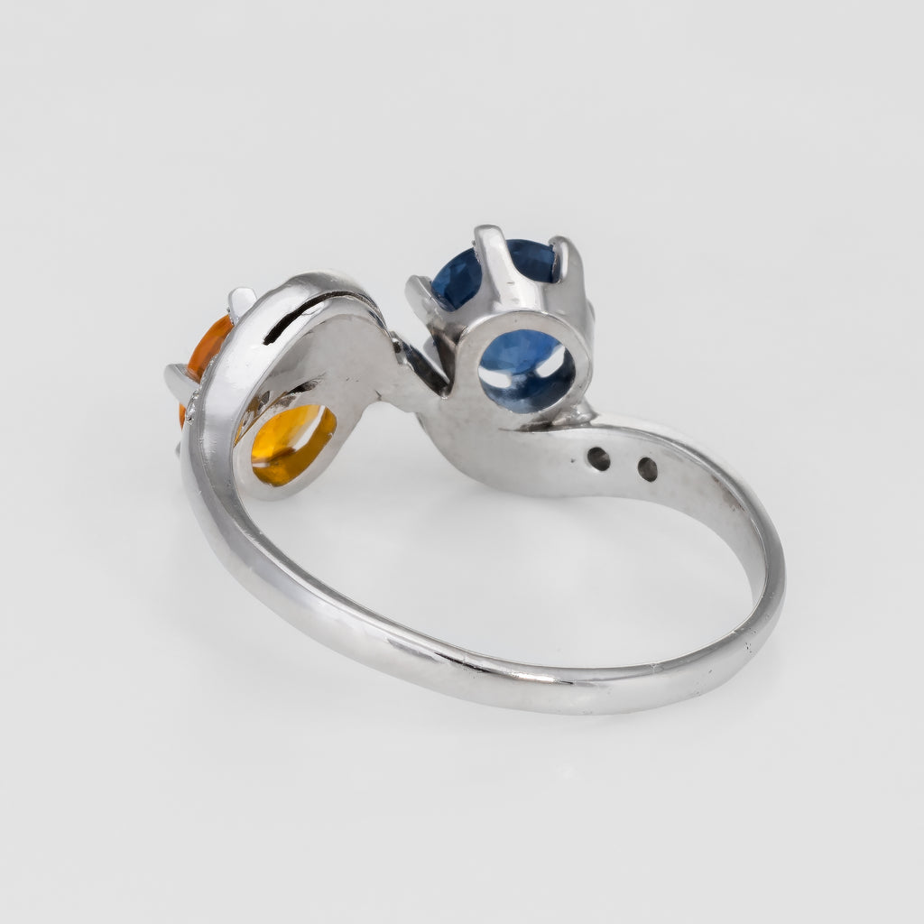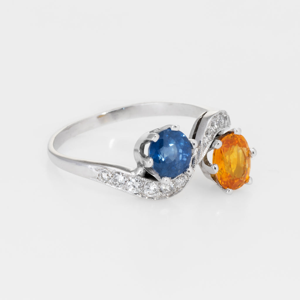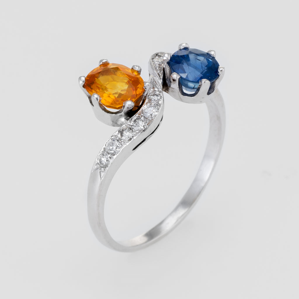 Stones: One round mixed cut Natural Sapphire, approx. 0.90 carats (5.5 x 3.7mm), dark blue color, moderately included, good cut, Sri Lanka origin, heated. One oval mixed cut Natural Sapphire, approx. 0.90 carat (5.5 x 3.7mm), medium slightly brownish-yellow color, moderately included, good cut, Sri Lanka origin, heated. 12 full cut diamonds, total weight approx. 0.30 carats, G-H/VS-SI qualities, good cuts. The sapphires are in excellent condition and free of cracks or chips.