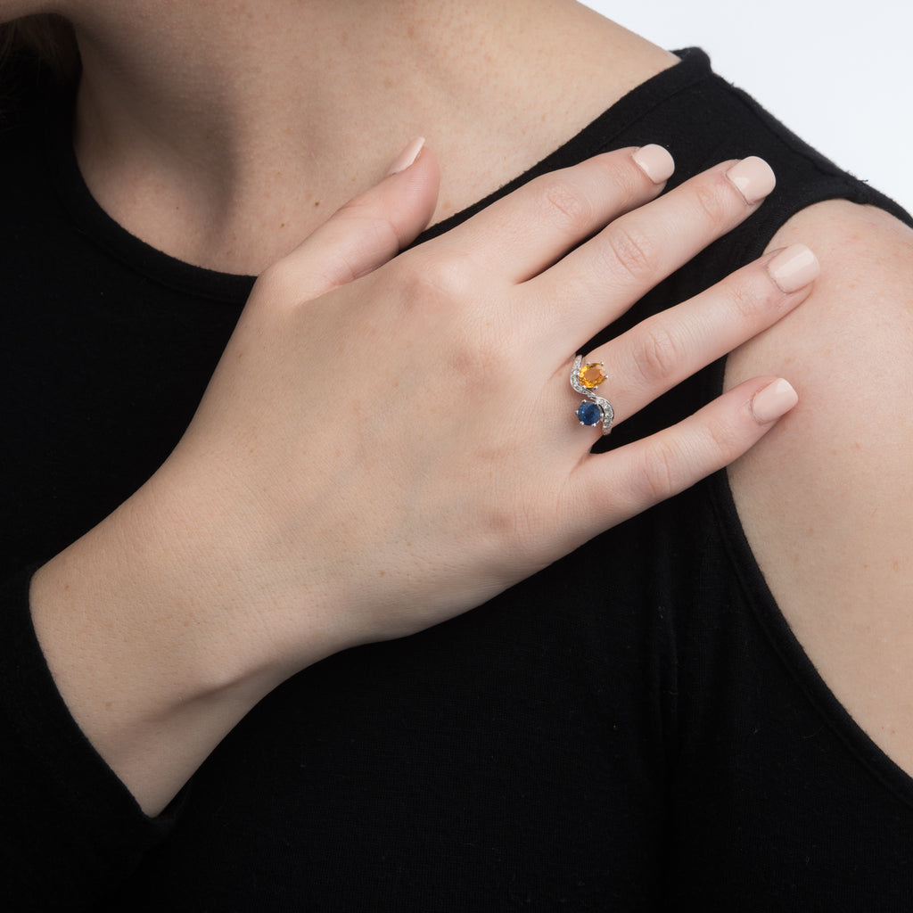 One round mixed cut Natural Sapphire, approx. 0.90 carats (5.5 x 3.7mm), dark blue color, moderately included, good cut, Sri Lanka origin, heated. One oval mixed cut Natural Sapphire, approx. 0.90 carat (5.5 x 3.7mm), medium slightly brownish-yellow color, moderately included, good cut, Sri Lanka origin, heated. 12 full cut diamonds, total weight approx. 0.30 carats, G-H/VS-SI qualities, good cuts. The sapphires are in excellent condition and free of cracks or chips.