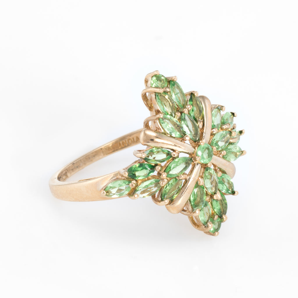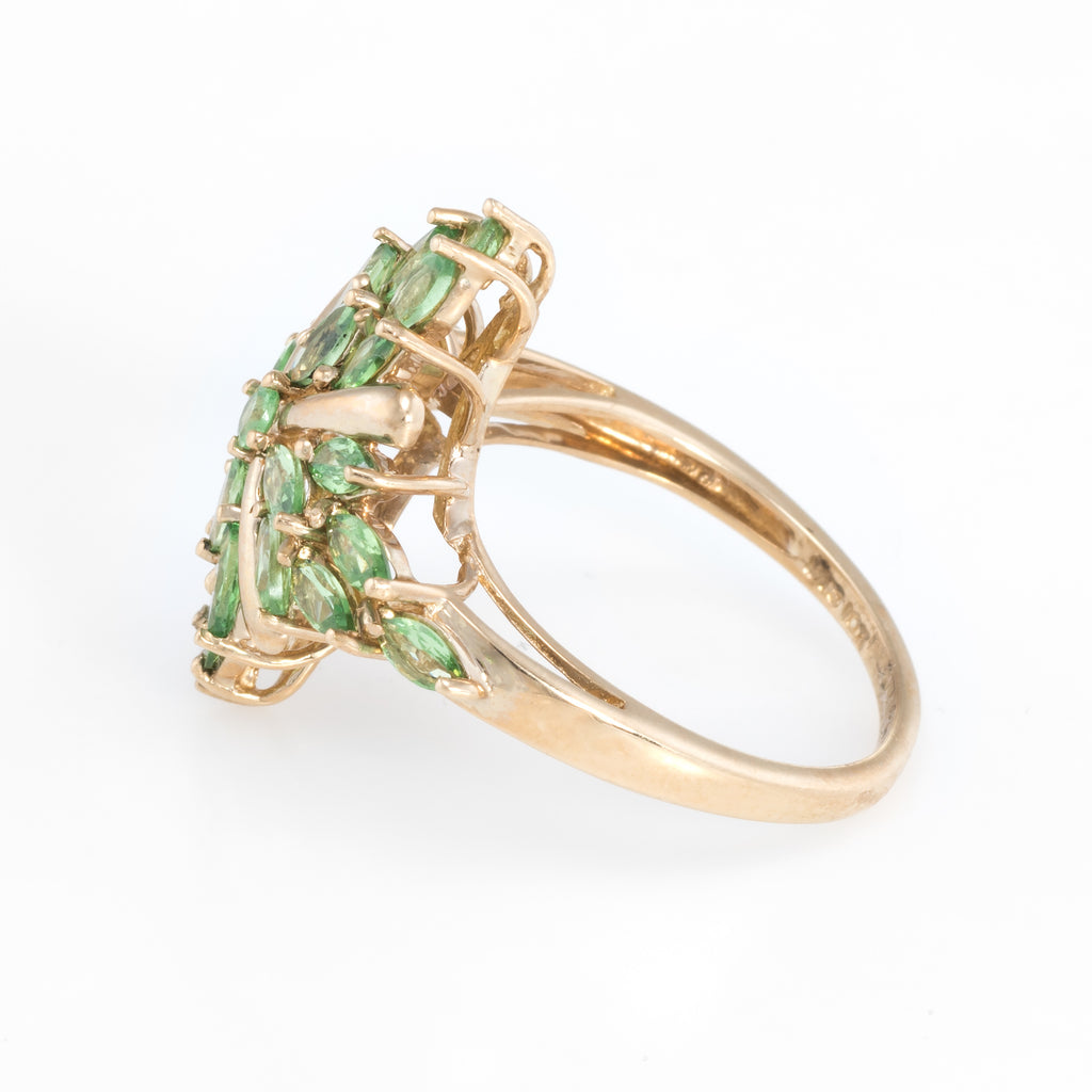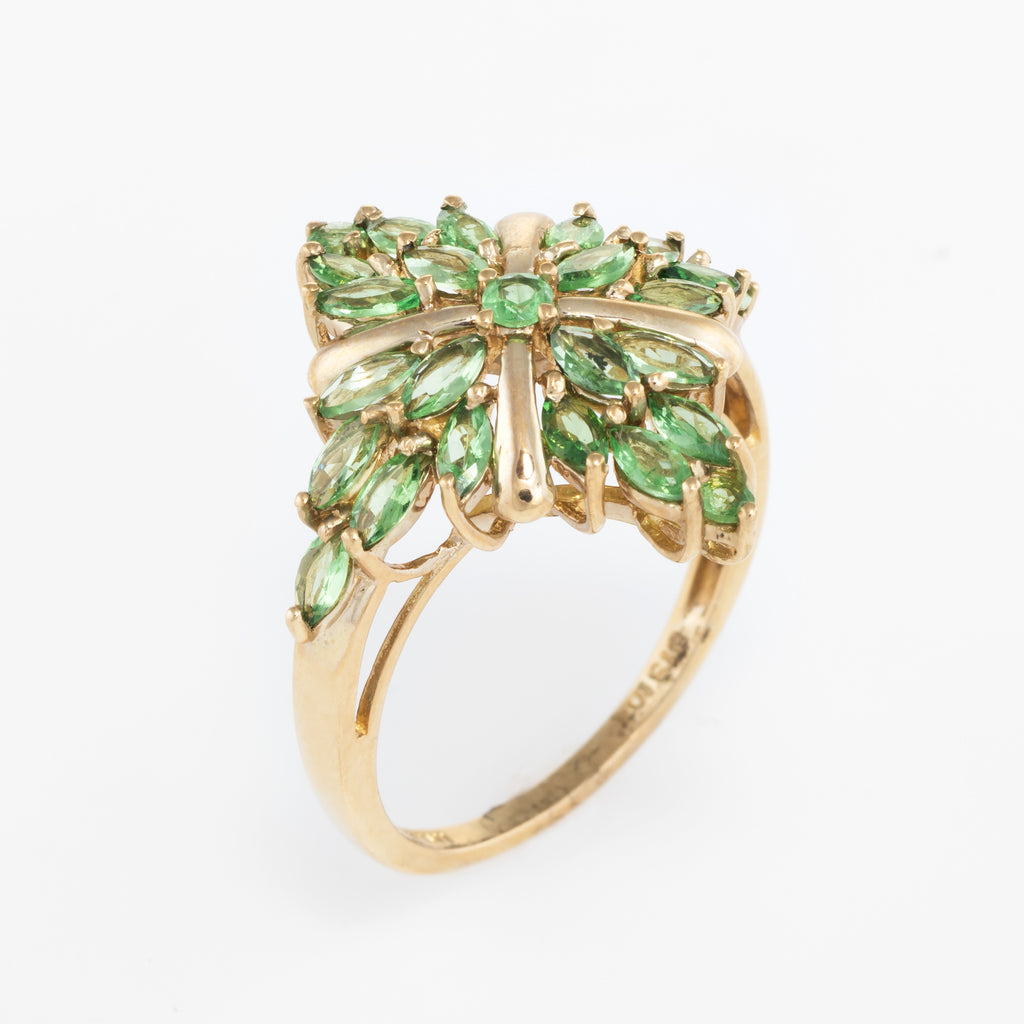 Stones:  Marquise & round cut tsavorite garnets total an estimated 2 carats. The garnets are in excellent condition and free of cracks or chips.