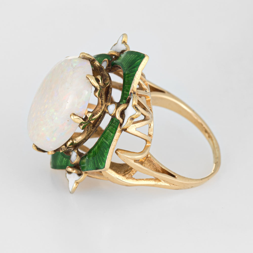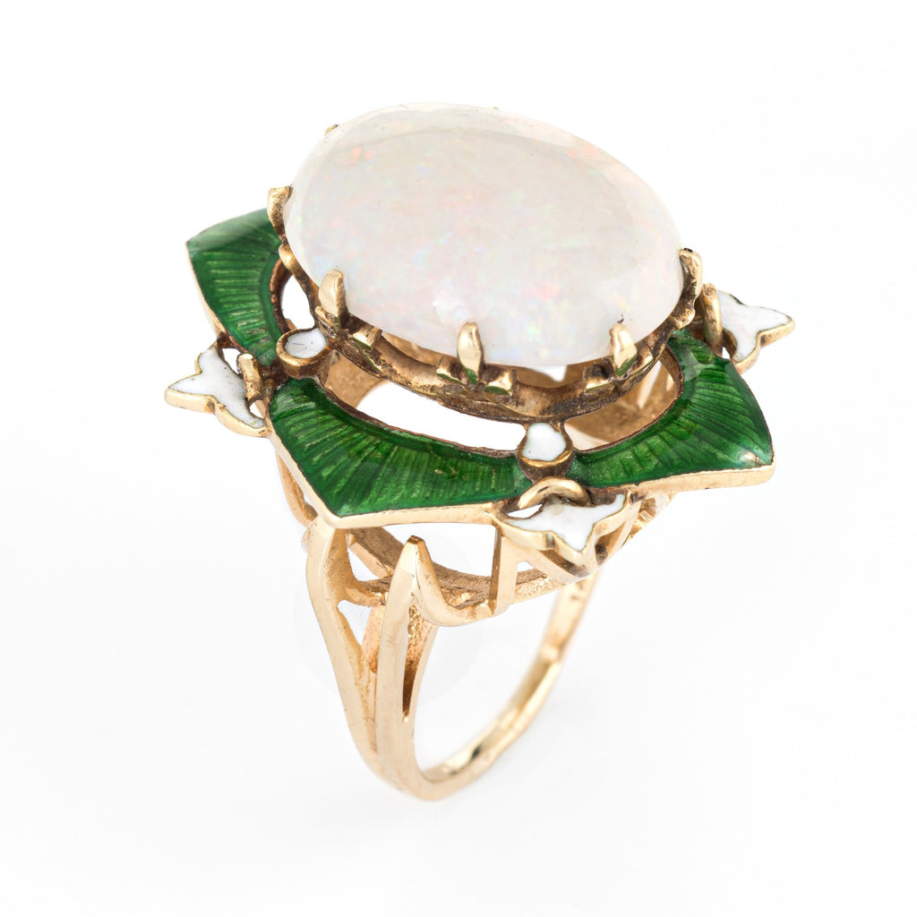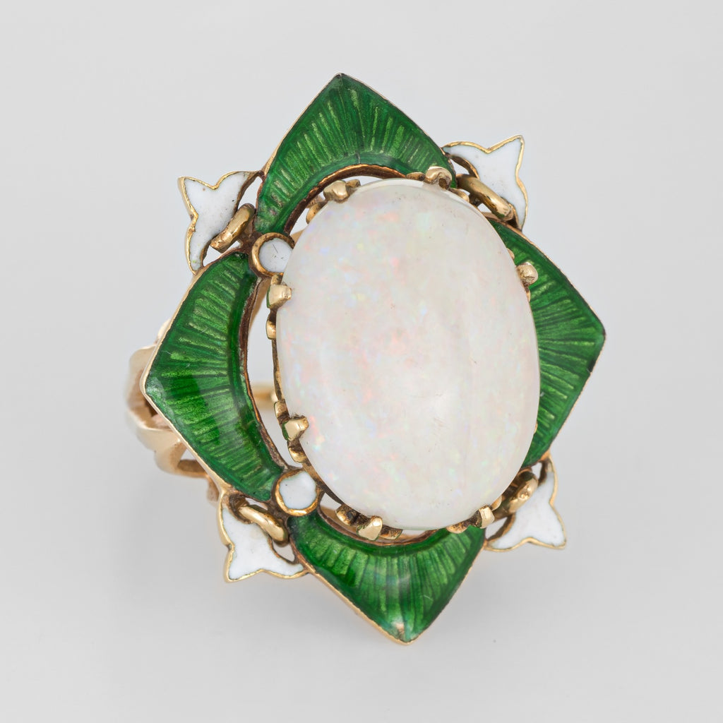 Elegant vintage Art Deco era opal & enamel cocktail ring (circa 1920s to 1930s), crafted in 14 karat yellow gold.