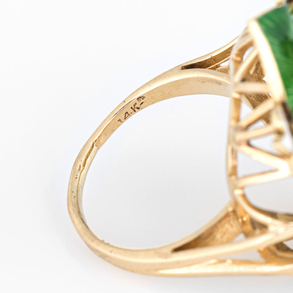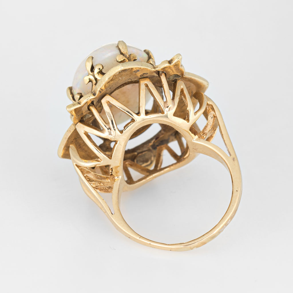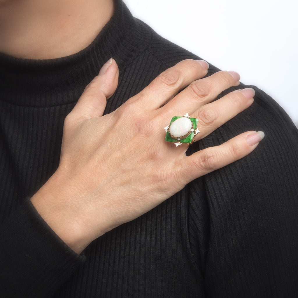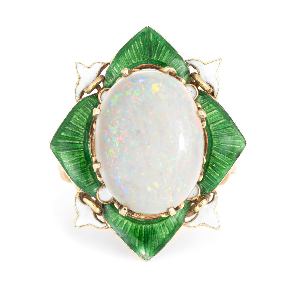 Elegant vintage Art Deco era opal & enamel cocktail ring (circa 1920s to 1930s), crafted in 14 karat yellow gold.