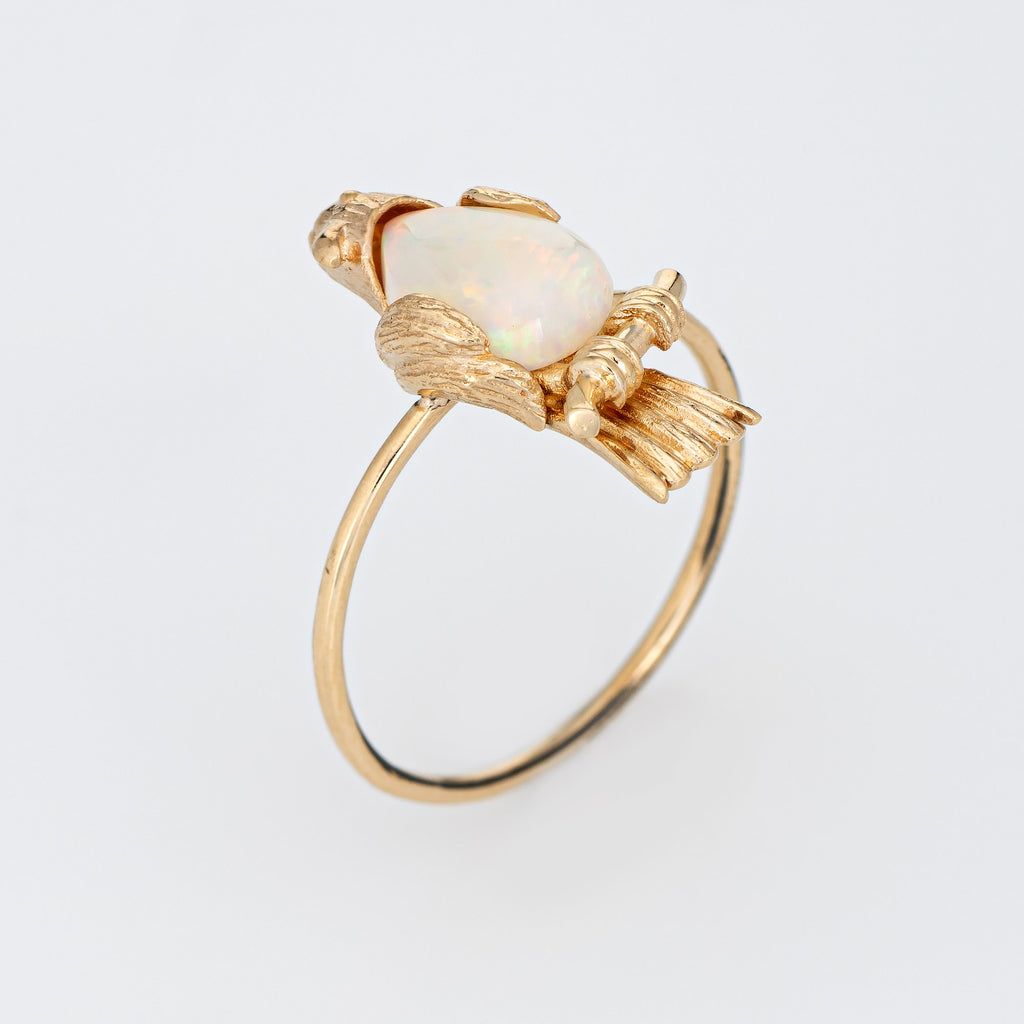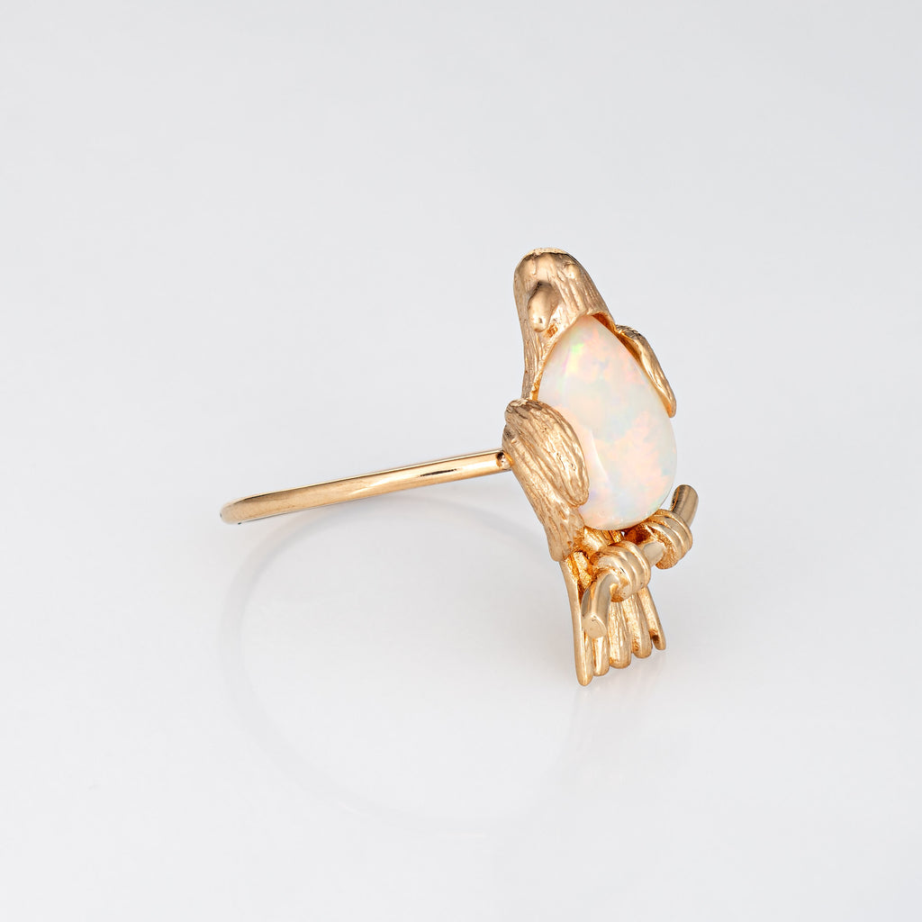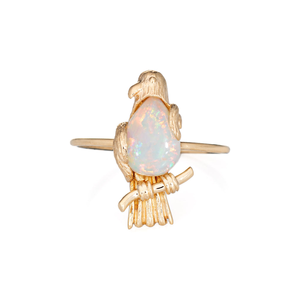 The ring is mounted with the original stick pin. Our jeweler rounded the stick pin into a slim band for the finger. The beautifully detailed bird features lifelike detail, perched on a branch with a plump opal belly.