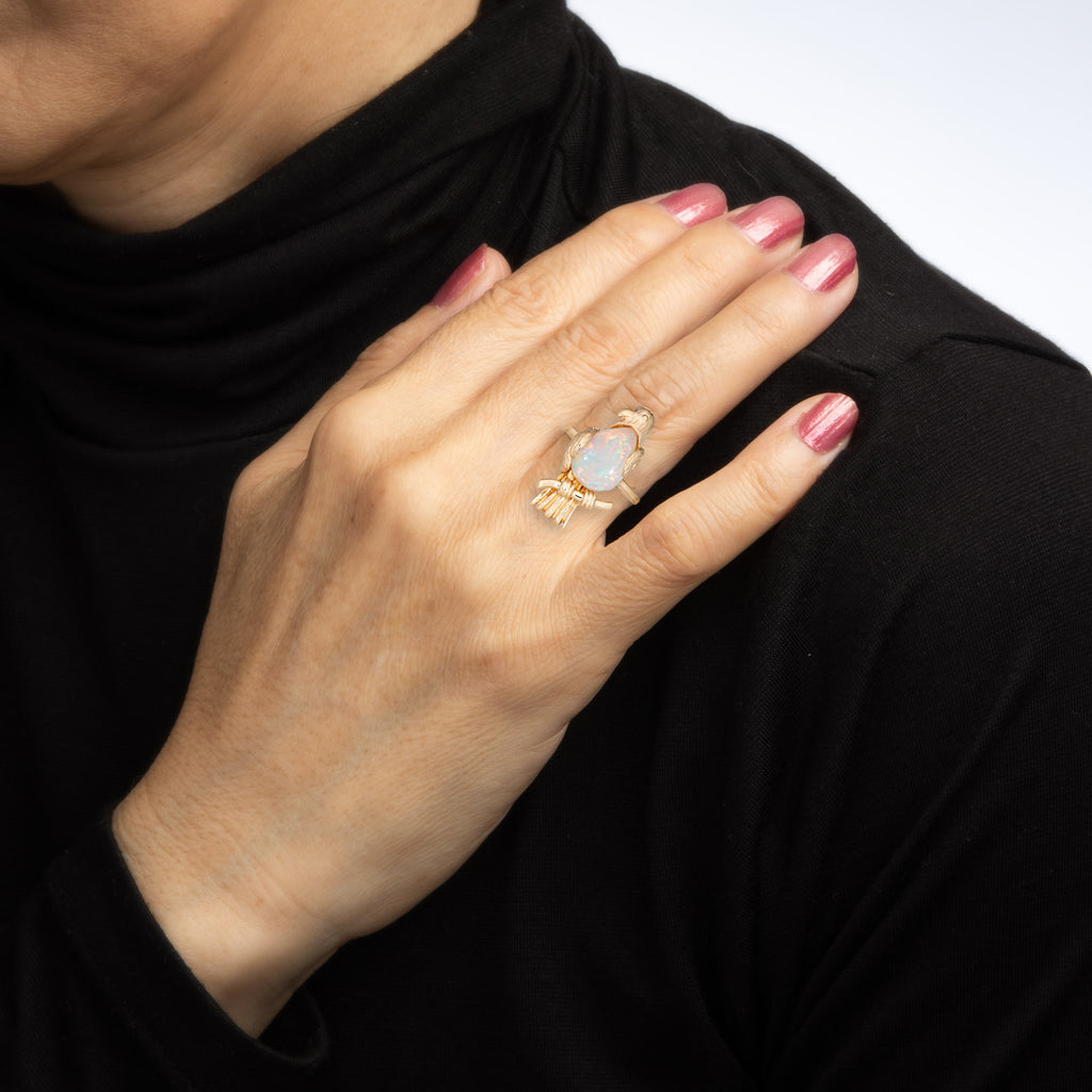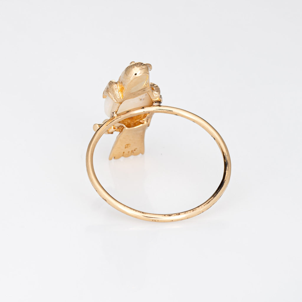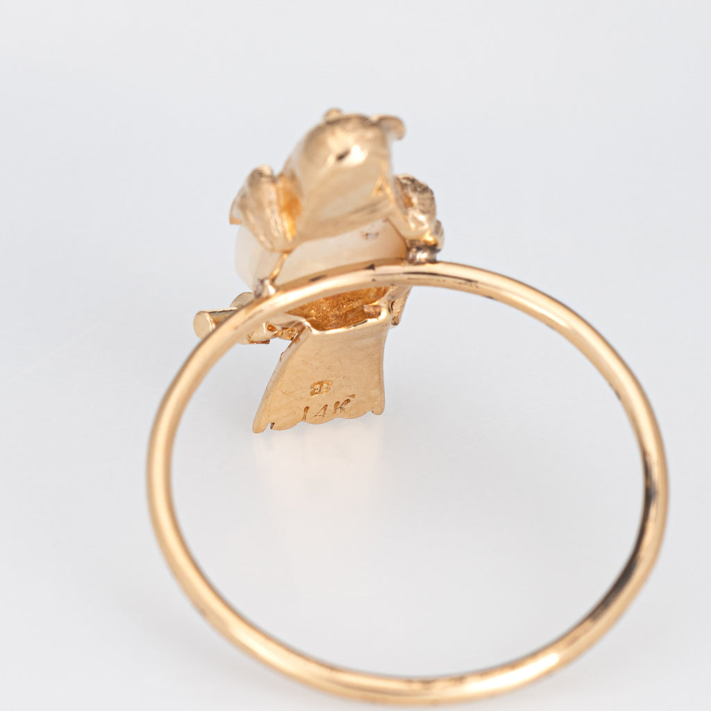 The ring is mounted with the original stick pin. Our jeweler rounded the stick pin into a slim band for the finger. The beautifully detailed bird features lifelike detail, perched on a branch with a plump opal belly.