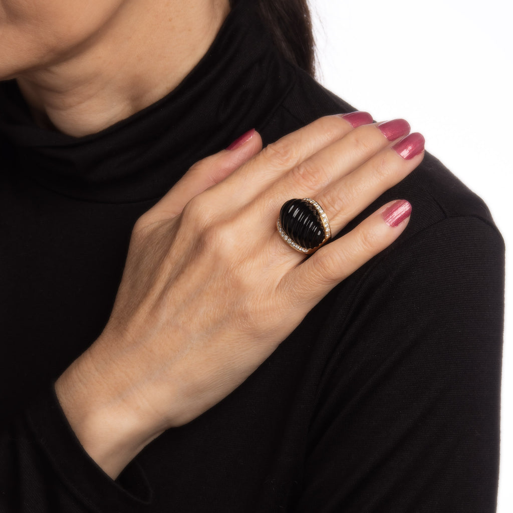 The fluted onyx is set in a high domed mount, framed with shimmering diamonds on both sides. The ring makes a great statement on the hand. The high rise ring (10.5mm - 0.41 inches) sits comfortably on the finger.