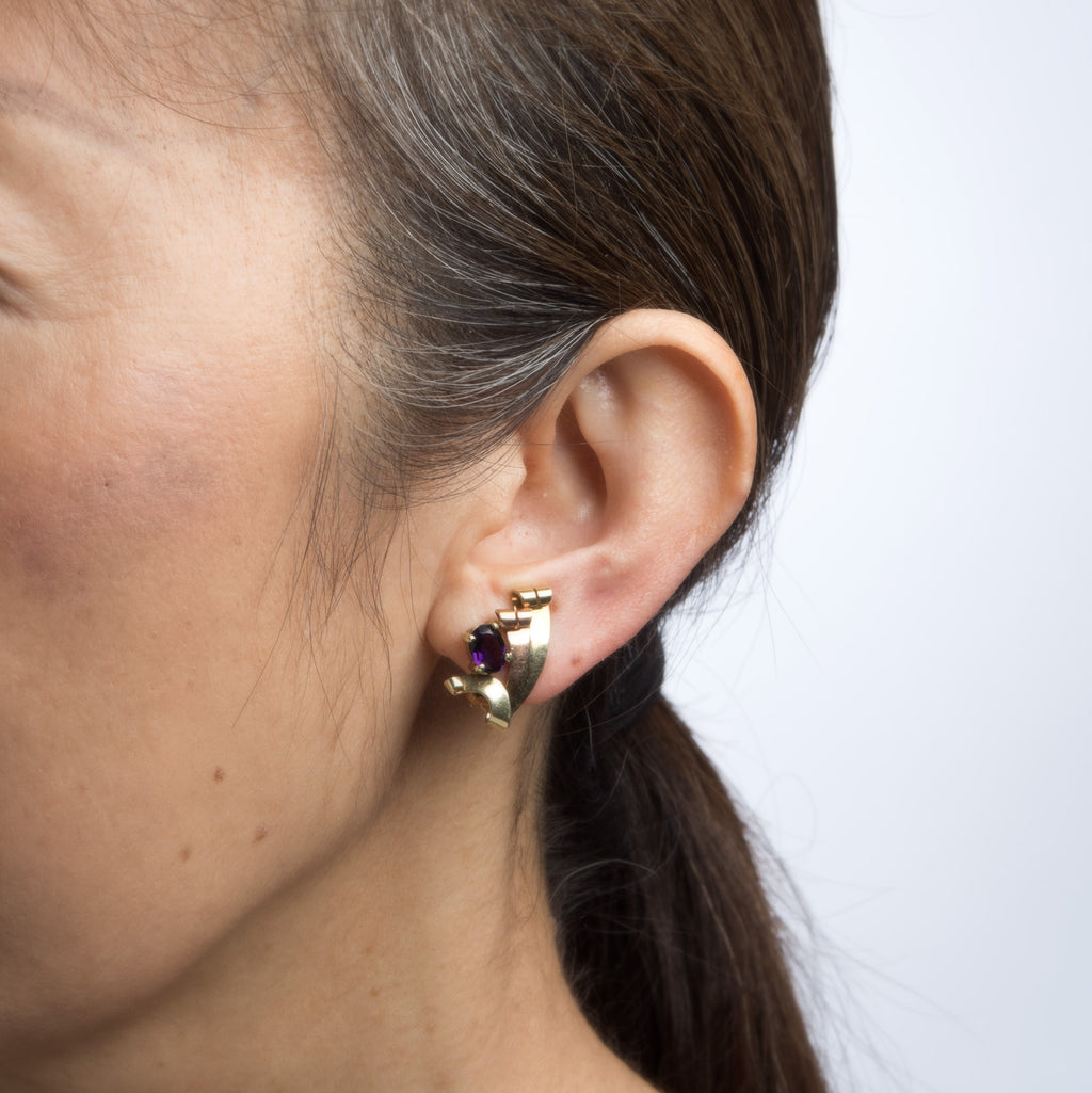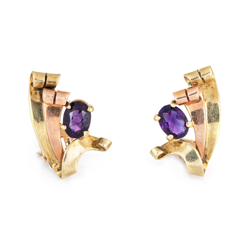 Elegant pair of retro vintage amethyst earrings (circa 1940s) crafted in 14k yellow & rose gold.