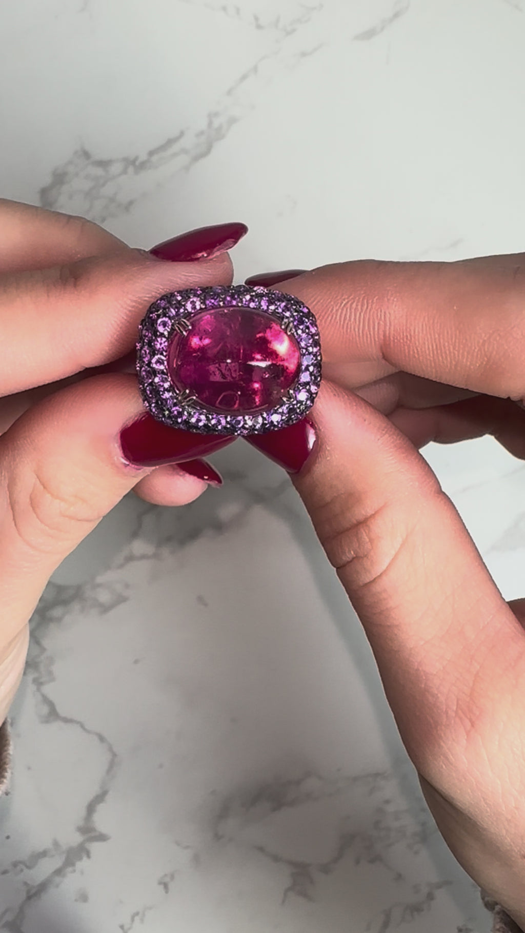 Rubellite cabochon measures 15mm x 12.5mm. Purple sapphires measure approx. 1.5mm each.