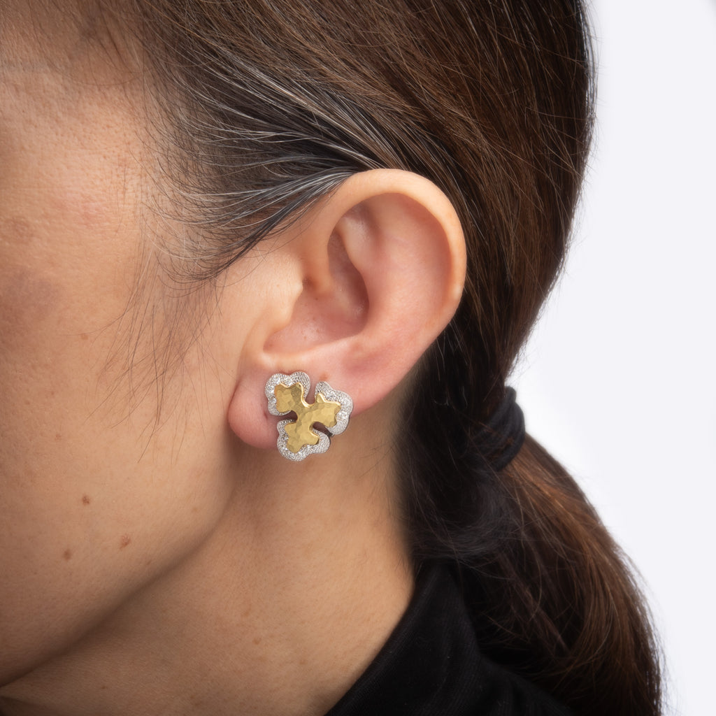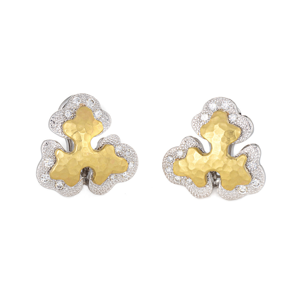 The organic like design features a hammered gold effect to the center in yellow gold, bordered with diamonds in white gold plumes to the outer edges. The clip on earrings are fitted with hinged omega backings for pierced or non-pierced ears.