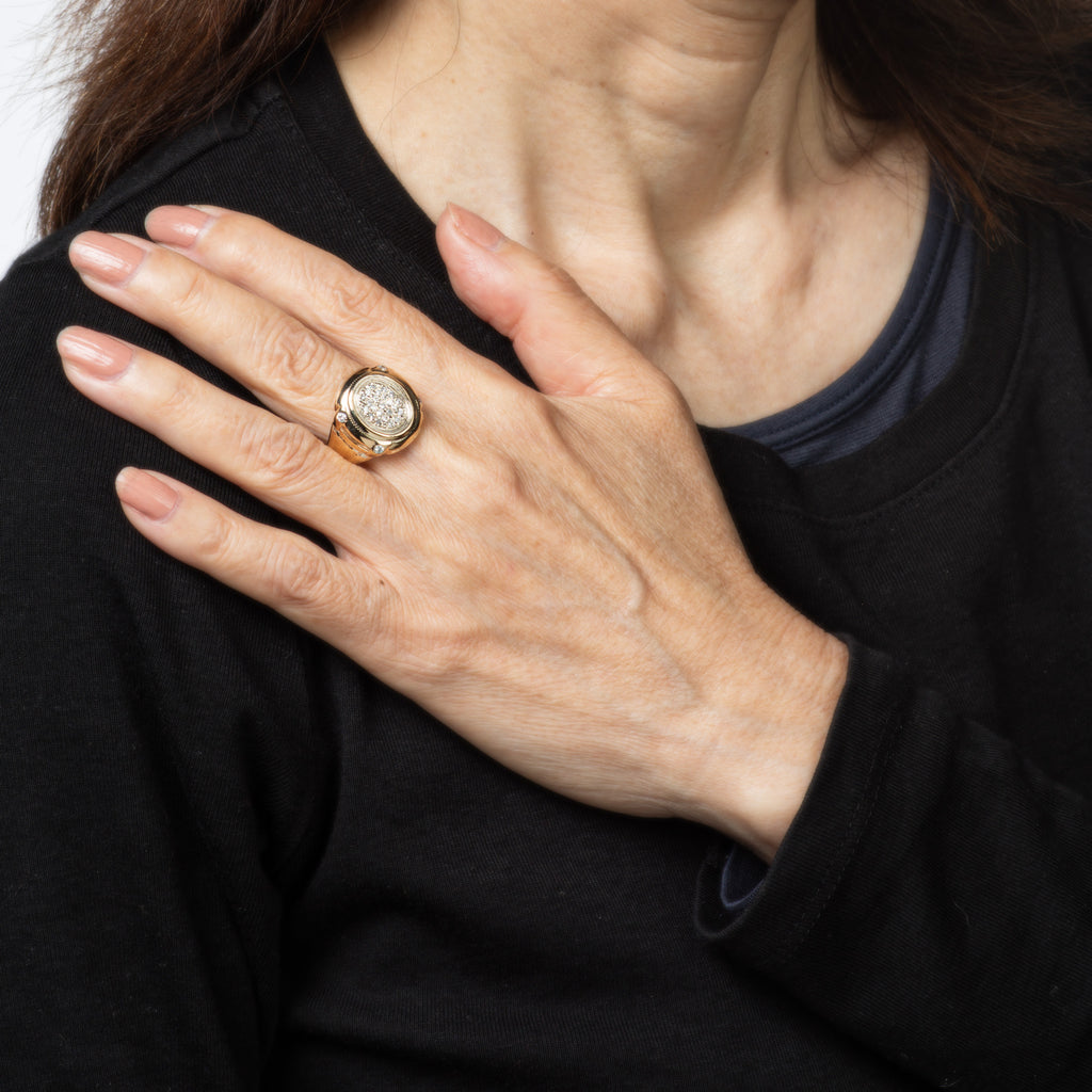 The oval signet features pave set diamonds to the center. The ring is great worn alone as a statement ring or stacked. The low rise ring (3.5mm - 0.13 inches) sits comfortably on the finger.