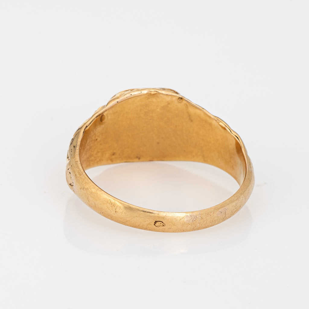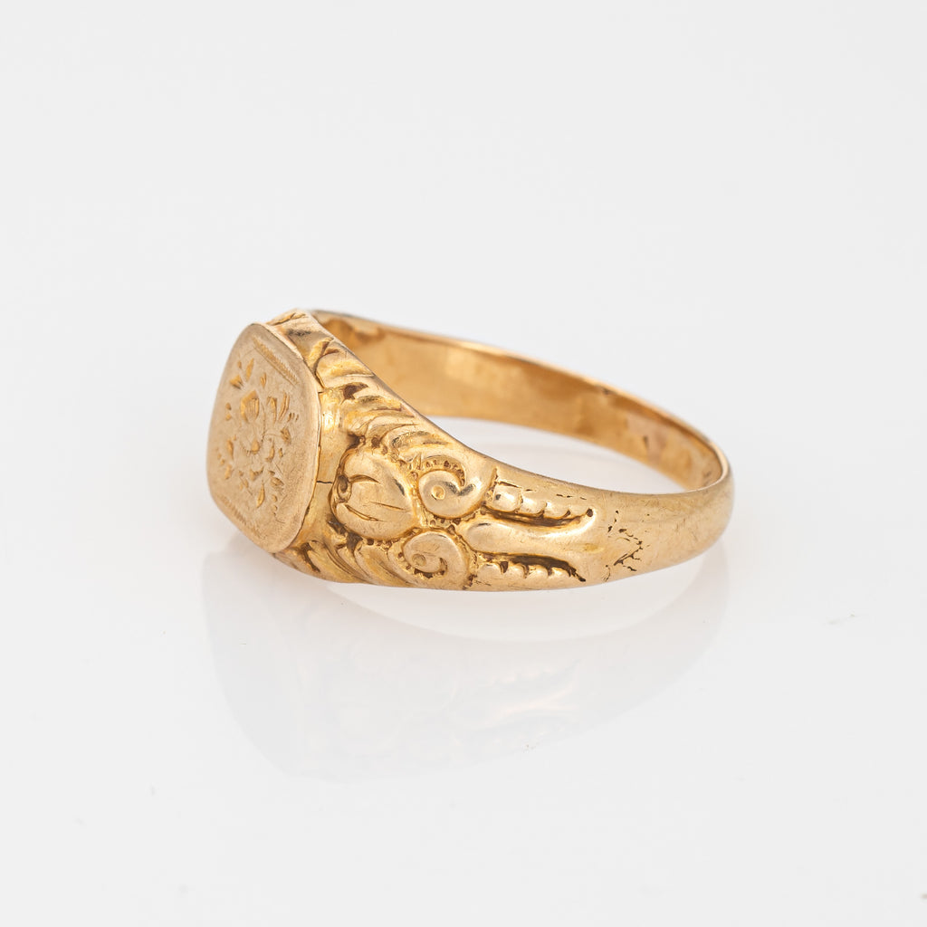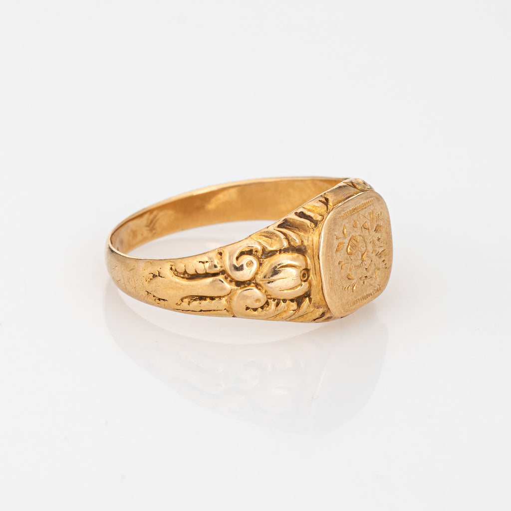 French Antique Belle Epoque Signet Ring 18k Yellow Gold Sz 5.5 Flowers Jewelry