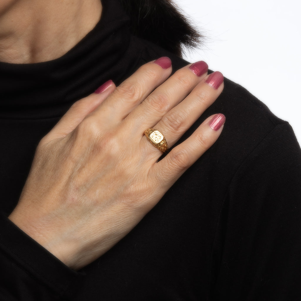 The small signet ring features an etched floral display to the square signet mount. The side shoulders are decorated with a display of flowers and scrolled details, a popular motif during the era. The low rise ring (2mm - 0.07 inches) sits comfortably on the finger.
