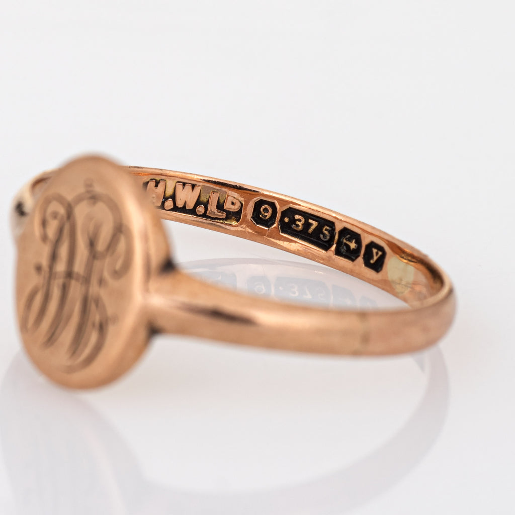 Metal & Hallmark: 9 karat rose gold. The ring is stamped with English hallmarks. The first hallmark is the Makers Mark "H.W Ld", followed by "9" and "375" for 9k gold. The next hallmark is the Mark of Origin for Birmingham, UK (anchor on its side). The final hallmark is the Date Letter sequence for the year 1923 (letter "y")