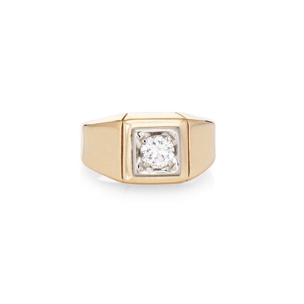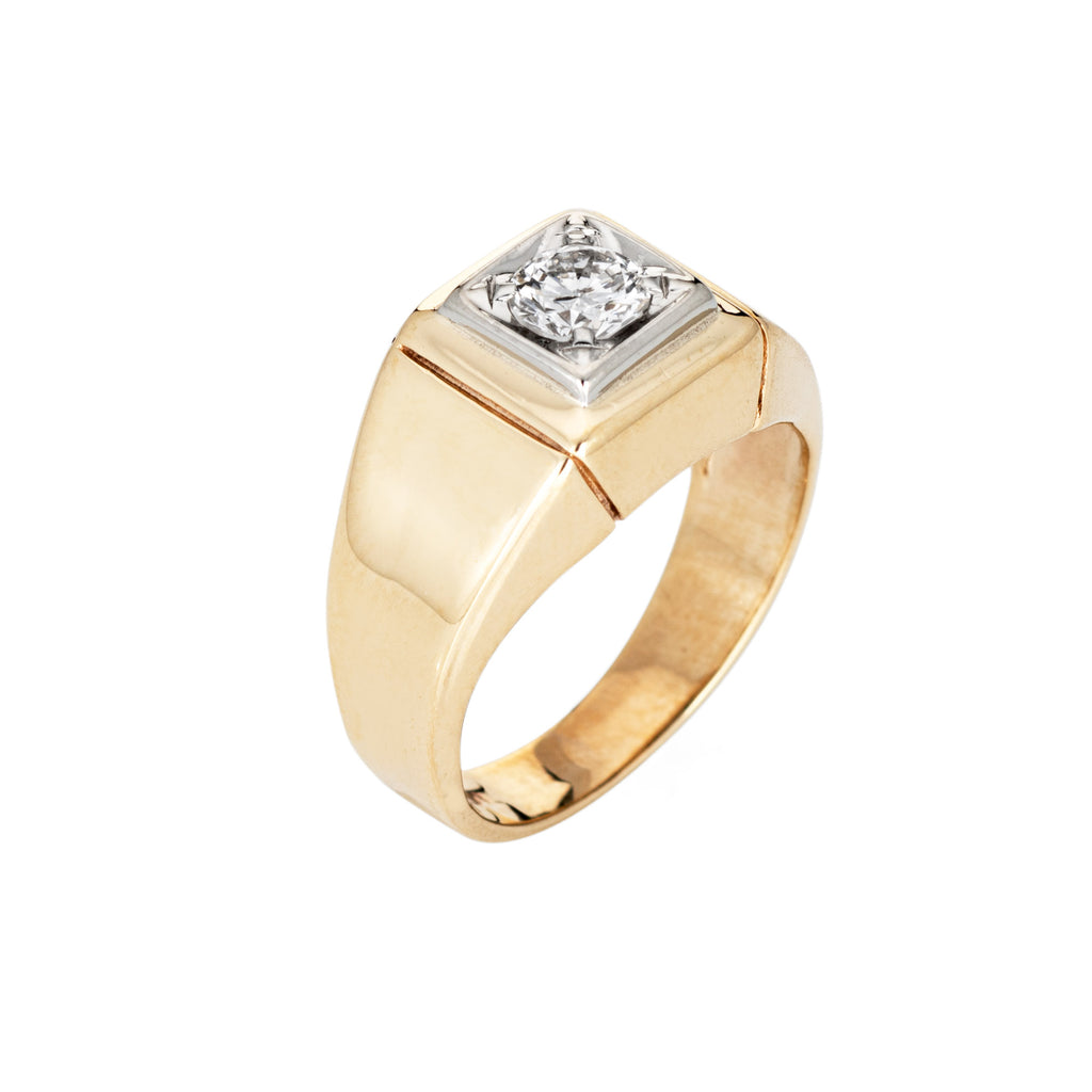 The square signet ring is set with an estimated 1/4 carat diamond. Small in size (4 1/2 and can be resized) the ring is great for wear on the pinky finger. The low rise ring (5.5mm - 0.21 inches) sits comfortably on the finger.
