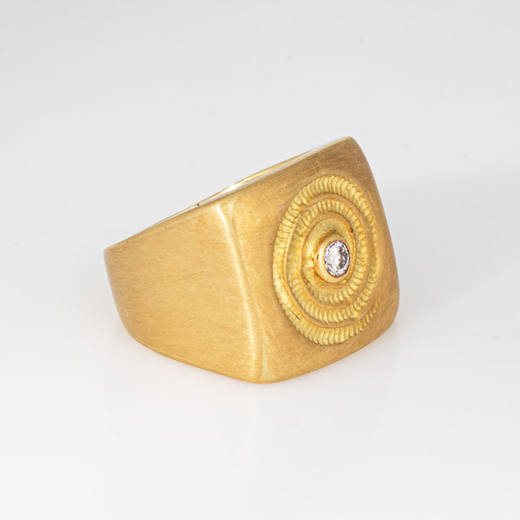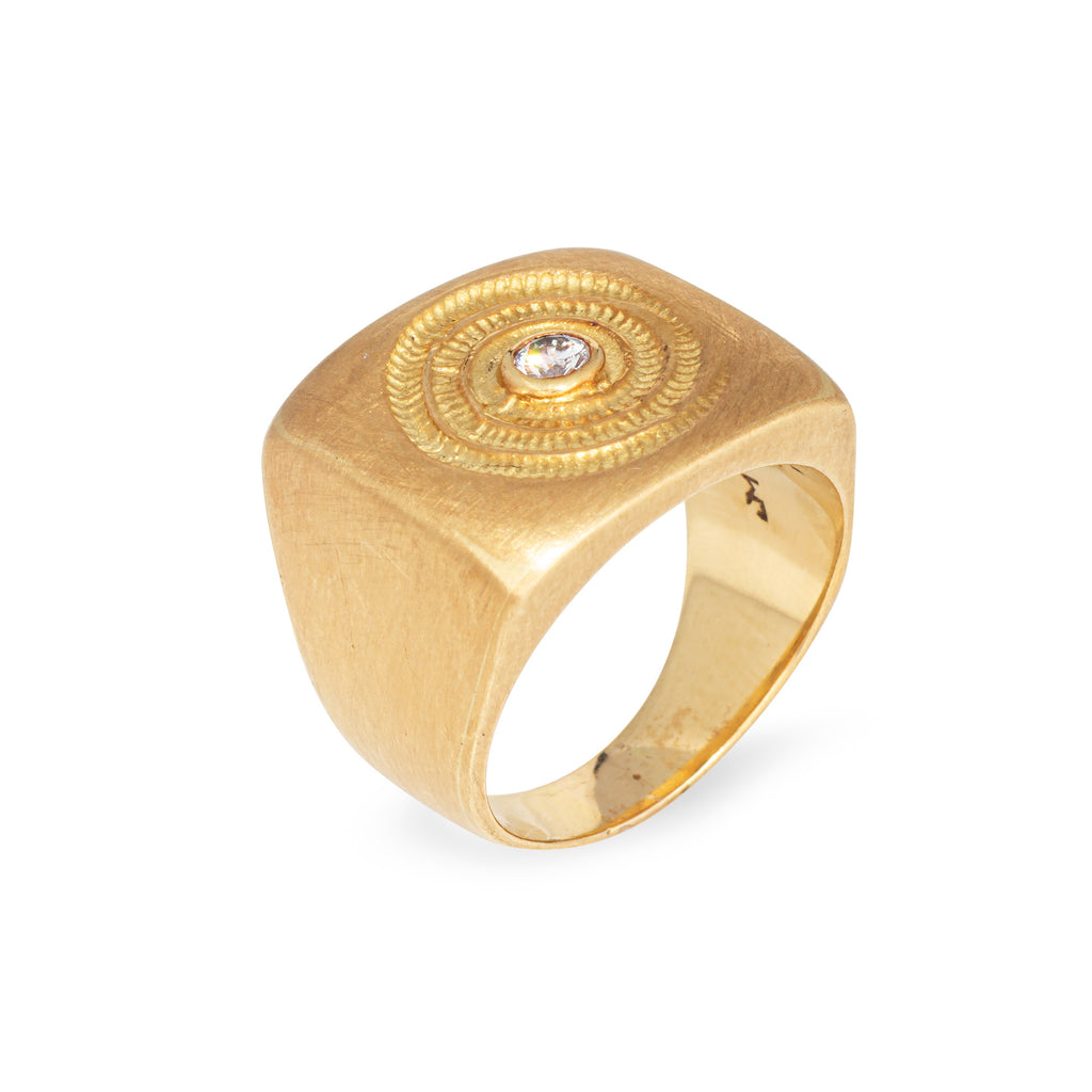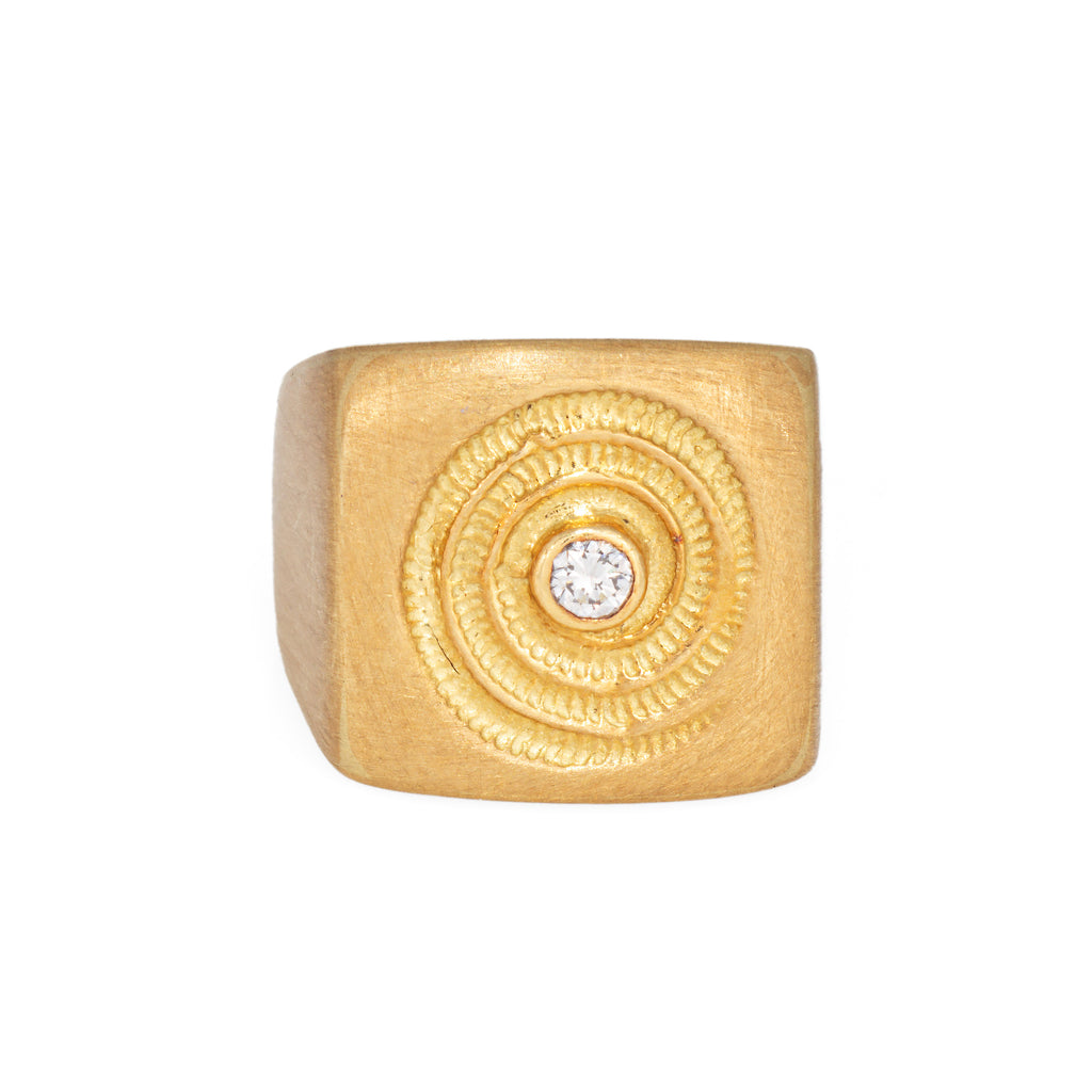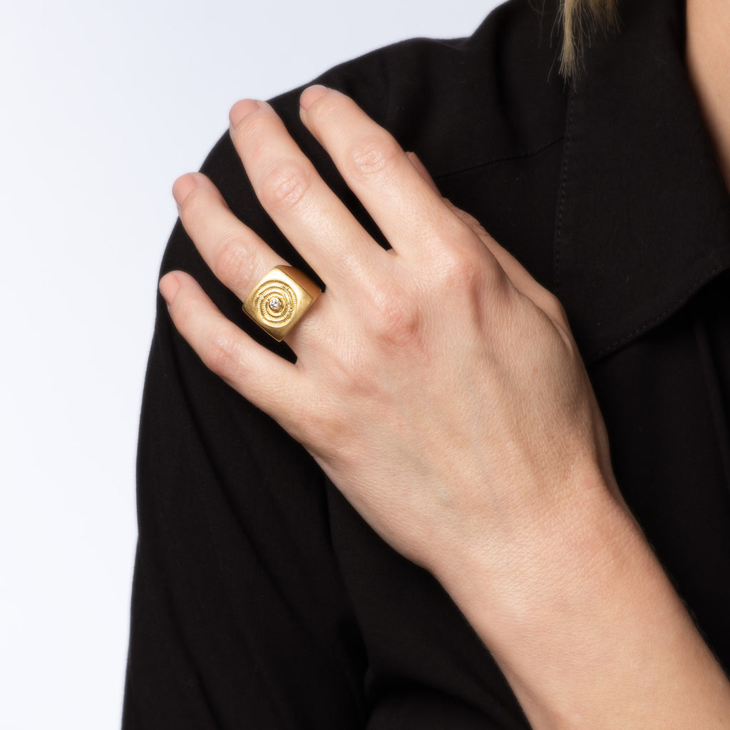 The square signet ring highlights a coiled fossil like design with a diamond set to the center. The ring features a satin finish that allows for a subtle and soft glow. The low rise ring (3.5mm - 0.13 inches) sits flat & comfortably on the finger.