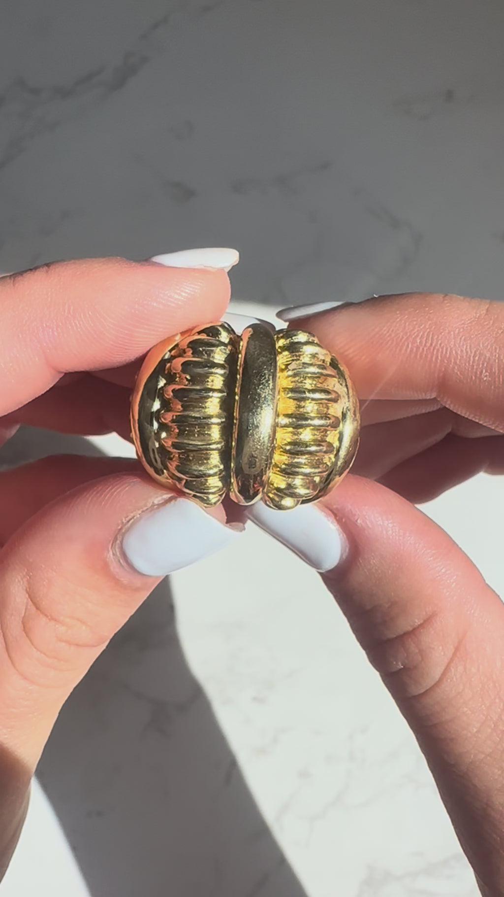 The bold ring highlights a sculpted ribbed dome design. The wide ring (21mm - 0.82 inches) makes a great statement on the hand! Weighing a hefty 20.7 grams the bright buttery 18k gold ring won't go unnoticed. It's a great example of jewelry from the 80s when bold cocktail rings made the ultimate statement on the hand (and so wearable today!) The medium-rise ring (11mm - 0.43 inches) sits comfortably on the finger.