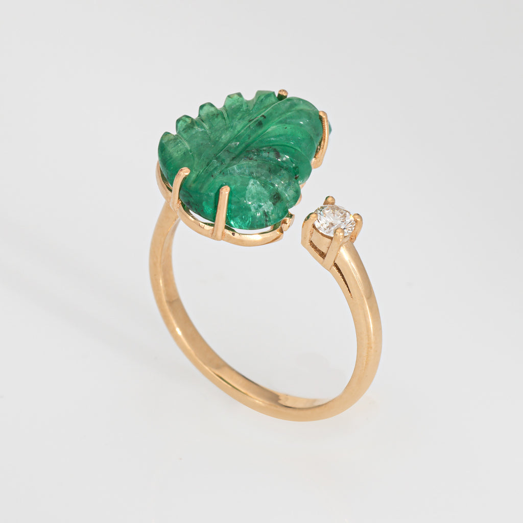The vibrant hand carved emerald and accenting diamond is a nature inspired ring that makes a lovely statement on the hand. The low rise ring (5.5mm - 0.21 inches) sits comfortably on the finger.