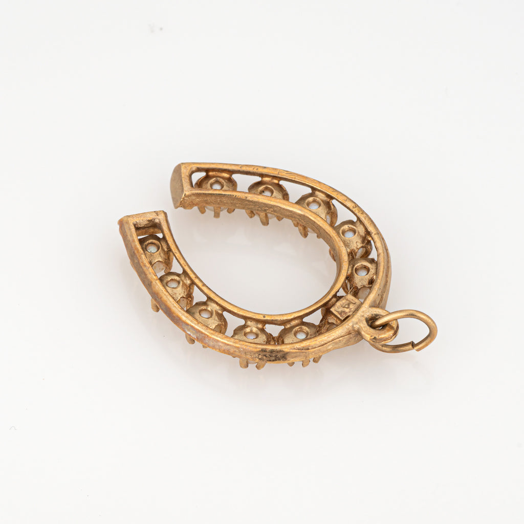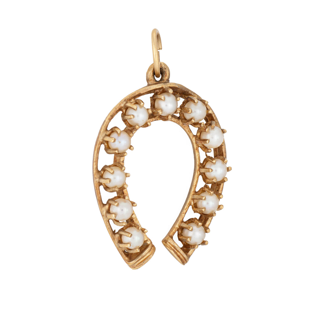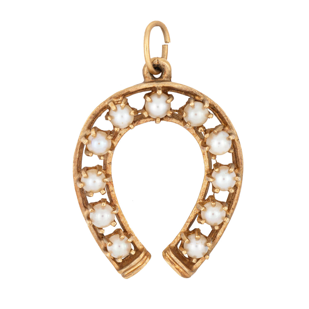 Finely detailed vintage cultured pearl horseshoe pendant crafted in 14k yellow gold (circa 1960s).