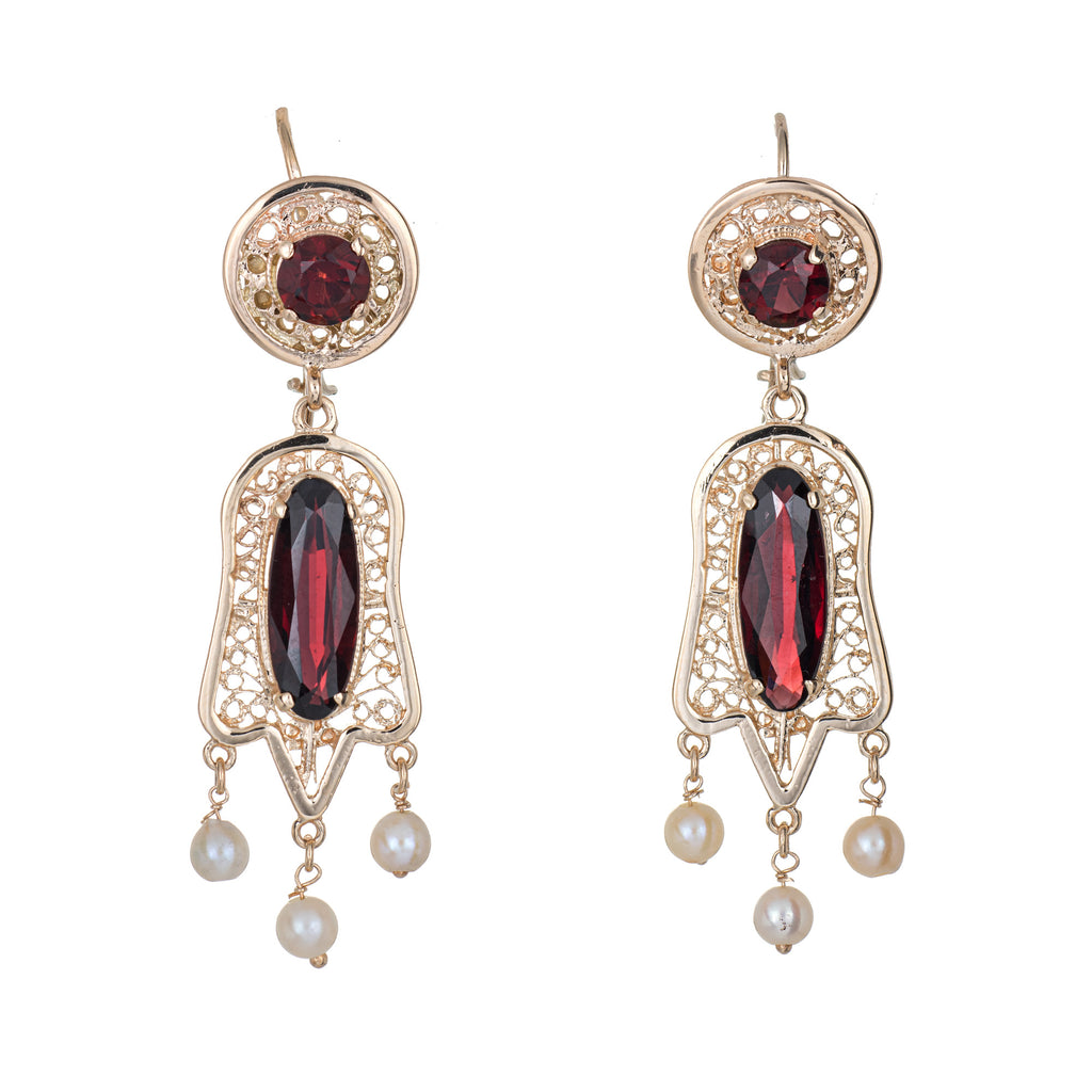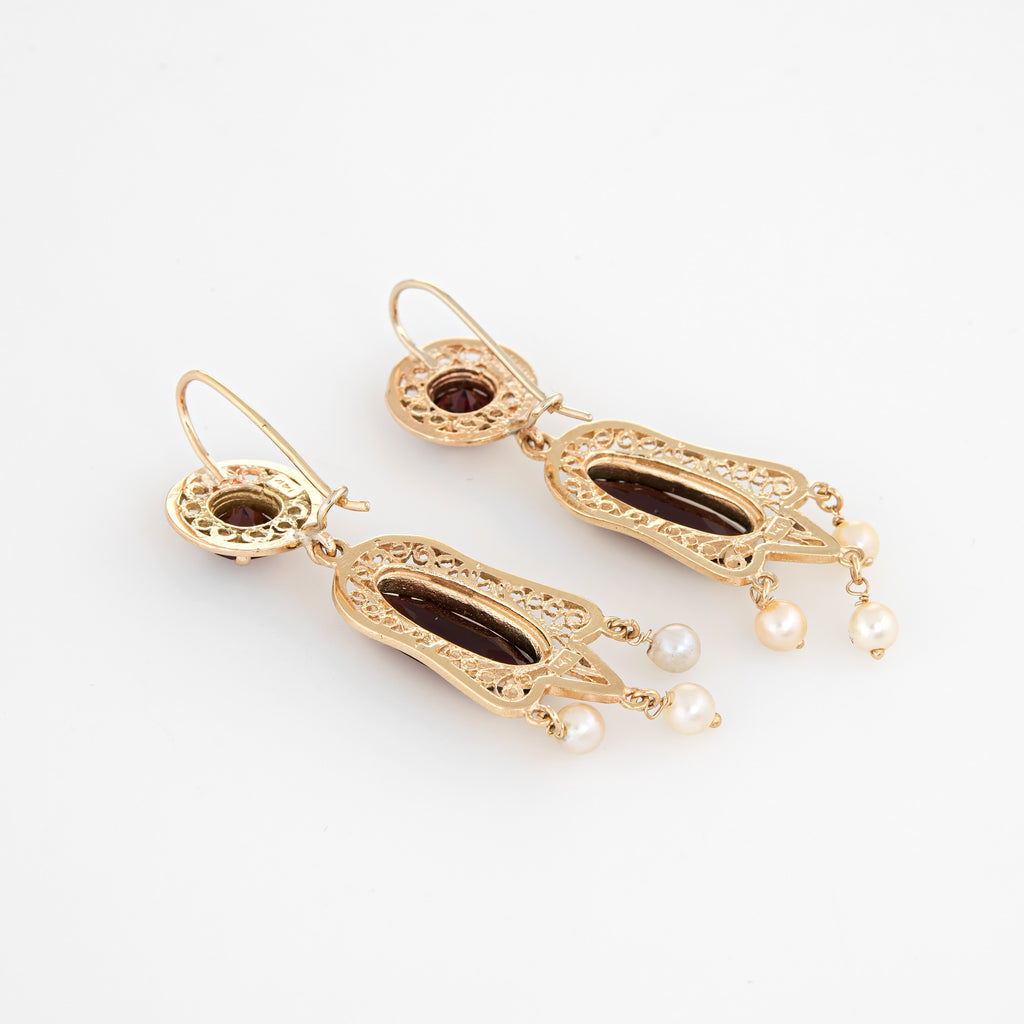 Elegant pair of estate garnet & cultured pearl earrings crafted in 14k yellow gold.
