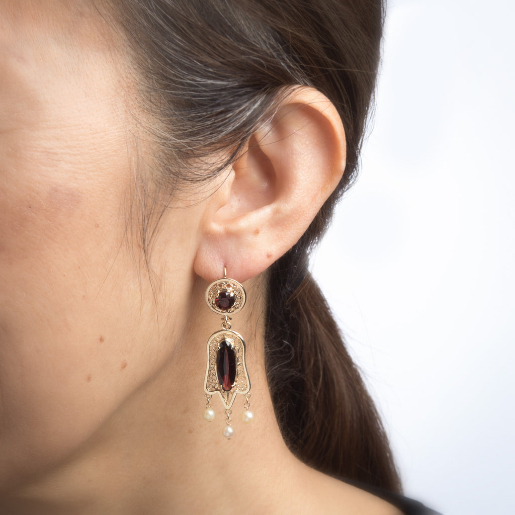 The charming earrings feature an openwork scrolled design with a fringe of pearls to the base. The faceted garnets are a rich merlot hue. Ideal for day or evening wear. The earrings are fitted with hook backings for pierced ears.