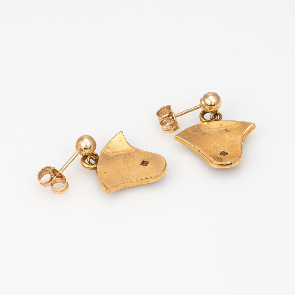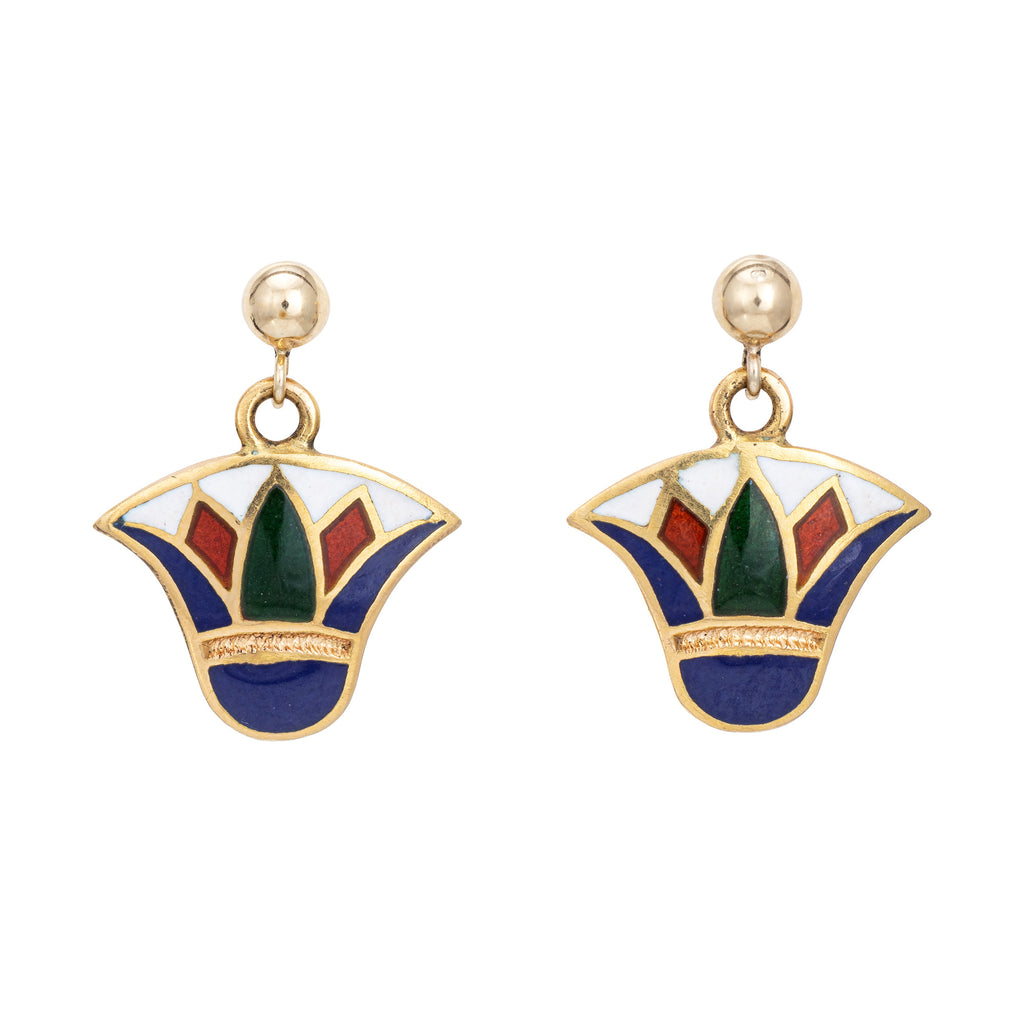 Lotus Flower Earrings Enamel Vintage 18k Yellow Gold Small Drops Fine Jewelry