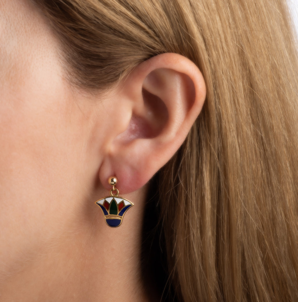 The sweet earrings feature blue, green, orange and white enameled detailing. The Lotus flower is a symbol of strength, resilience and rebirth. Smaller in scale, the earrings are great for day or evening wear.