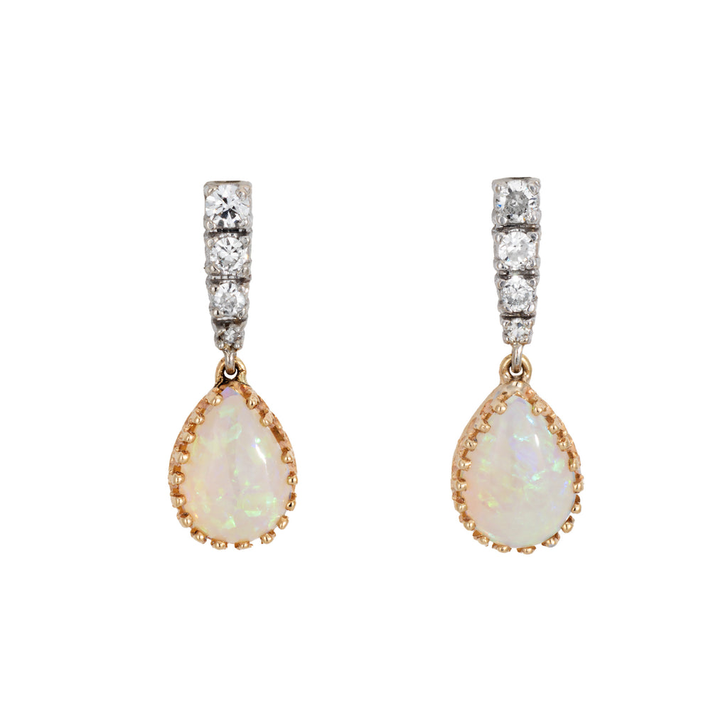 Stones: Cabochon pear cut opals measure 9mm x 6mm. Diamonds total an estimated 0.10 carats (estimated at H-I color and SI1-I1 clarity). The opals are in very good condition and free of cracks or chips.