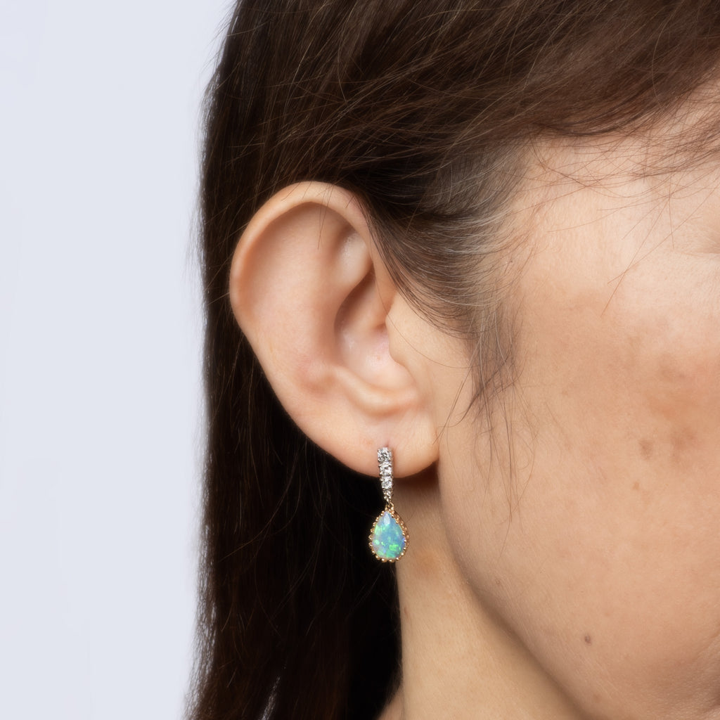 Cabochon pear cut opals measure 9mm x 6mm. Diamonds total an estimated 0.10 carats (estimated at H-I color and SI1-I1 clarity). The opals are in very good condition and free of cracks or chips.