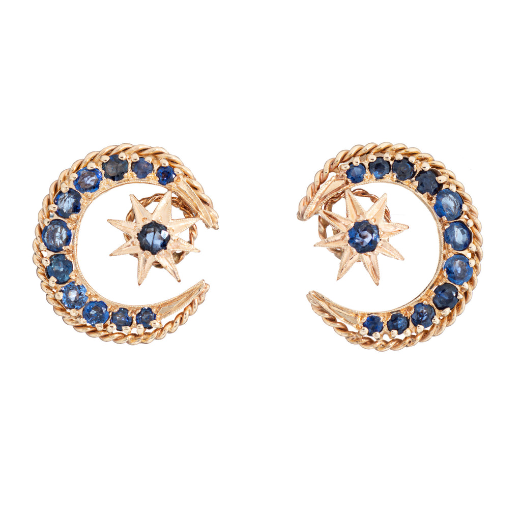 Stylish vintage sapphire crescent moon and star sapphire earrings crafted in 14 karat yellow gold (circa 1970s).