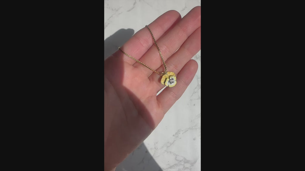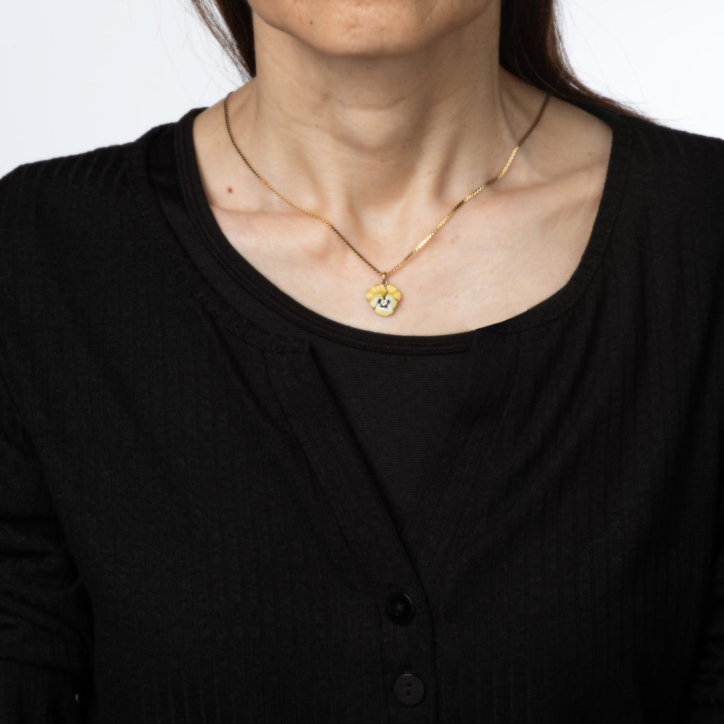One small diamond is estimated at approx. 0.03 carats (estimated at I-J color and SI2-I1 clarity). The beautifully enameled yellow pansy is a lovely example of Art Nouveau era style jewelry when floral and naturalistic themes were popular. Small in scale, the pendant & necklace is great worn alone or layered with your fine jewelry from any era. The necklace is a later addition to the pendant.