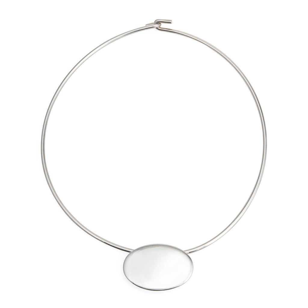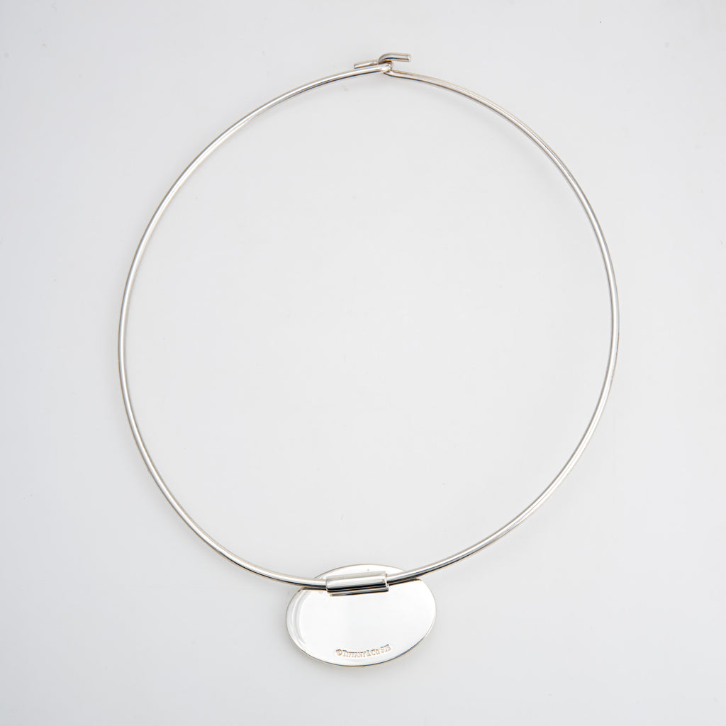 The collar necklace is fitted with an oval disc pendant (movable on the collar). Measuring 15.5 inches in length the necklace is designed to sit as a choker on the nape of the neck. The necklace is a retired piece and no longer made by Tiffany & Co.