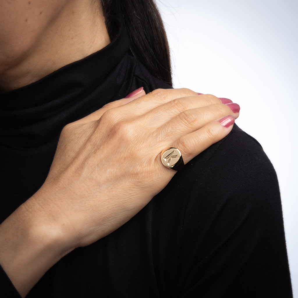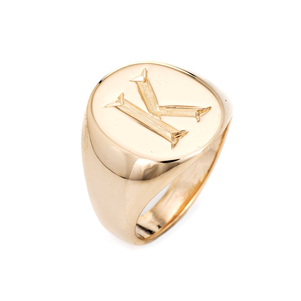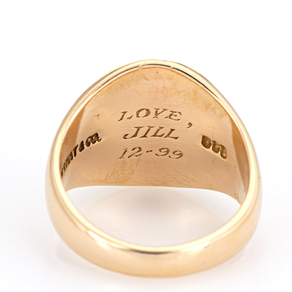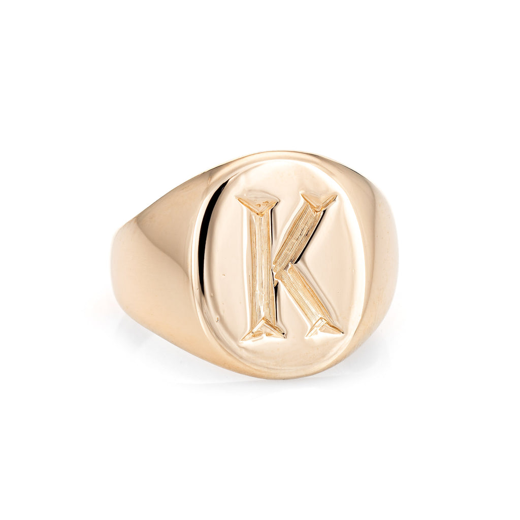 The oval signet mount is engraved with the letter 'K' (can be removed if desired). The signet ring is small in size and great worn on the pinky finger. The underside of the ring is engraved 'Love, Jill 12-99'.