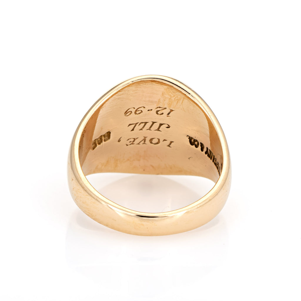 Finely detailed vintage Tiffany & Co signet ring crafted in 14k yellow gold.