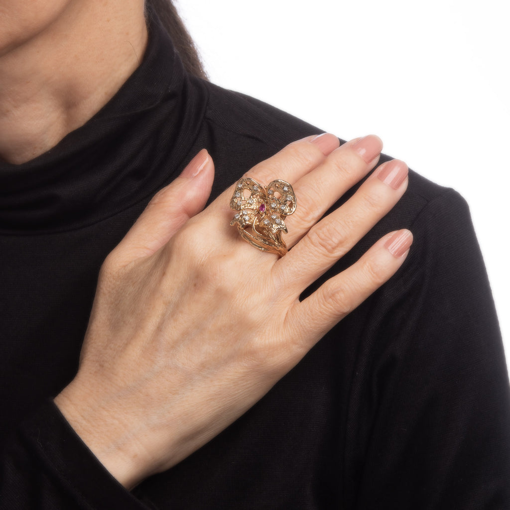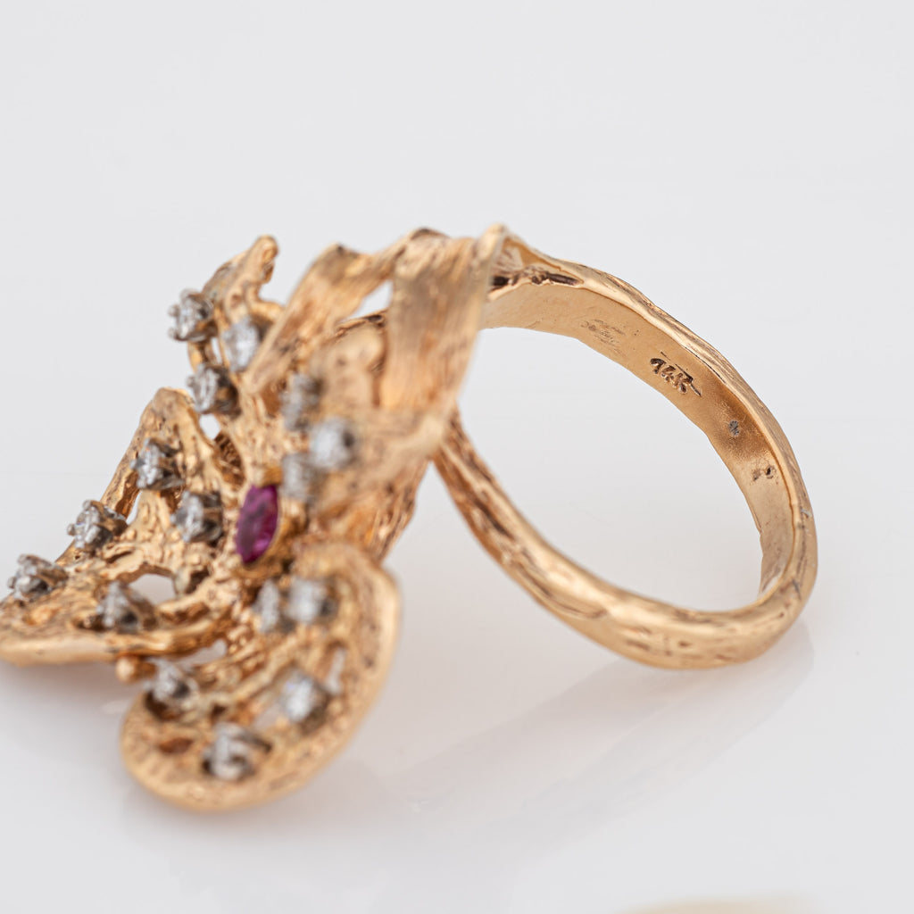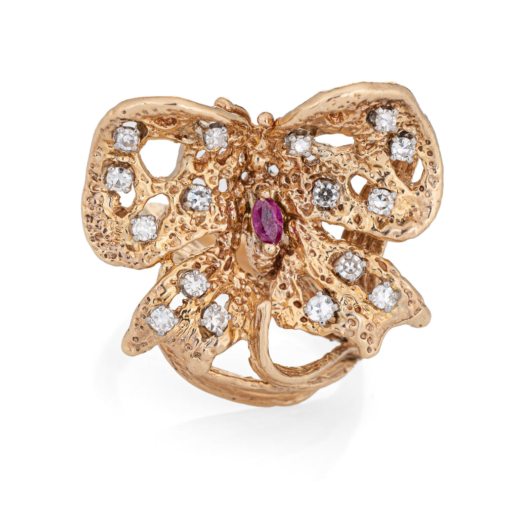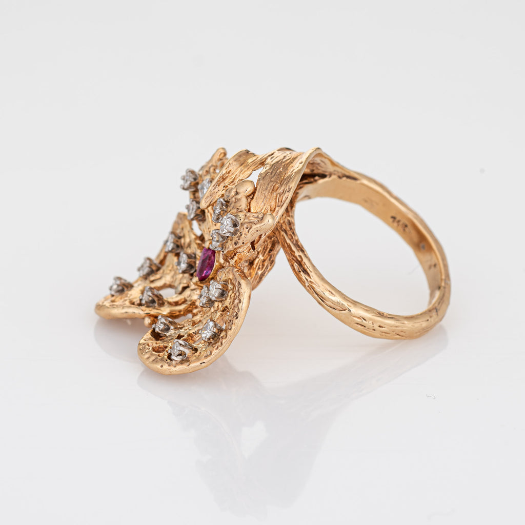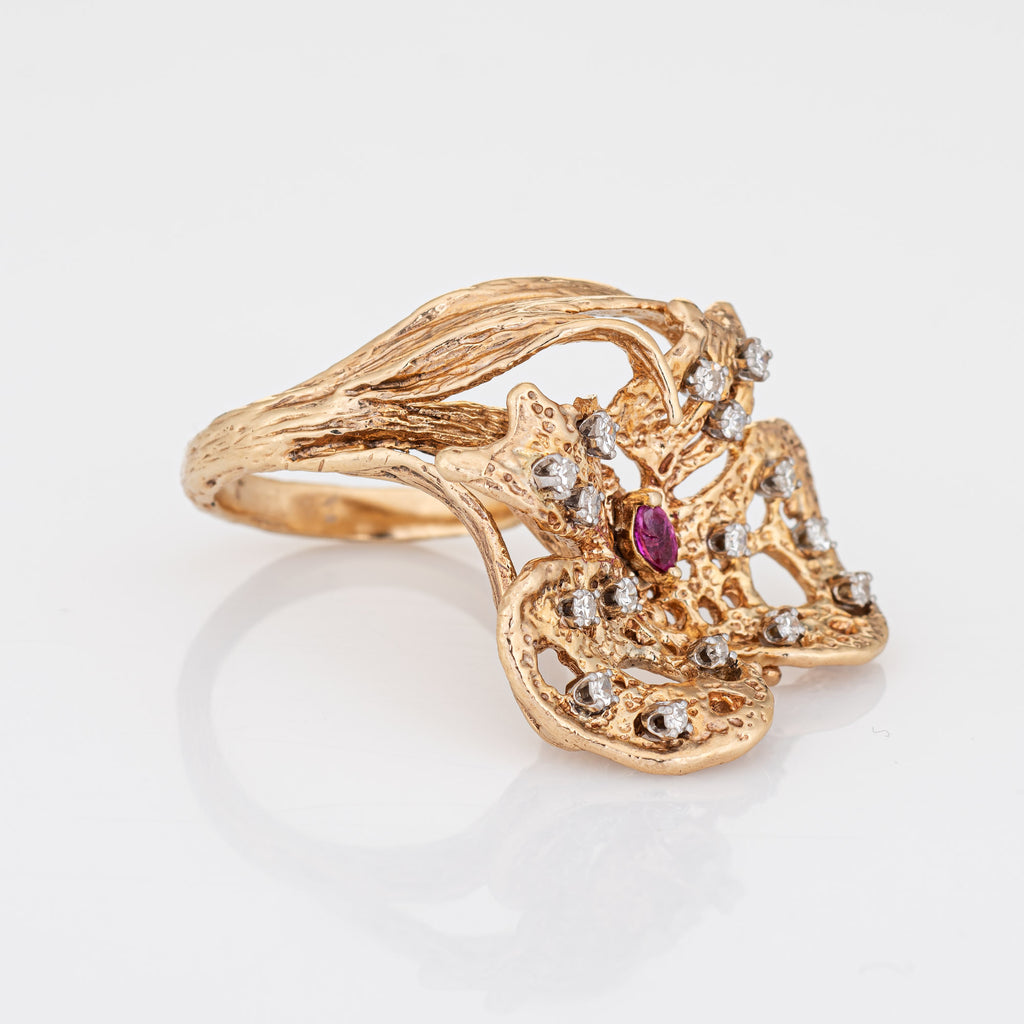 Stylish vintage abstract diamond & ruby butterfly ring (circa 1980s) crafted in 14 karat yellow gold.