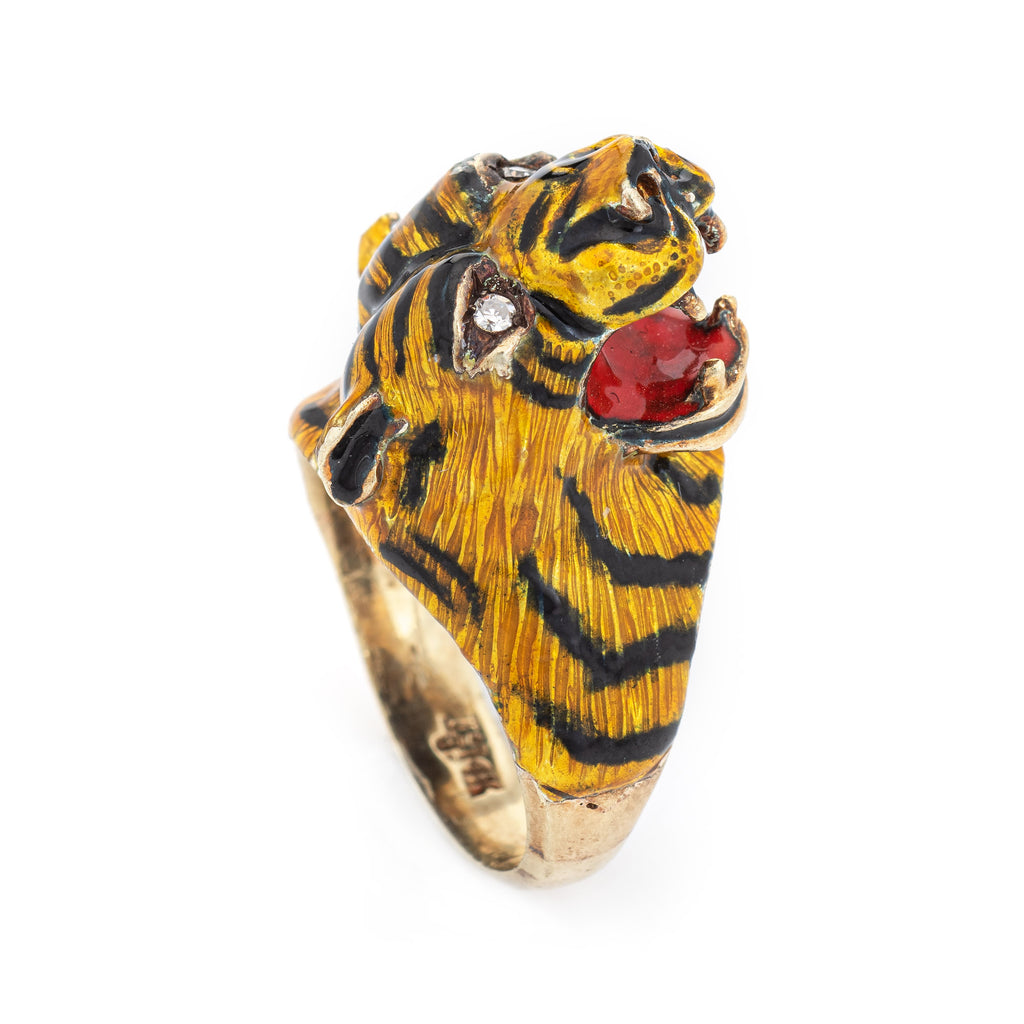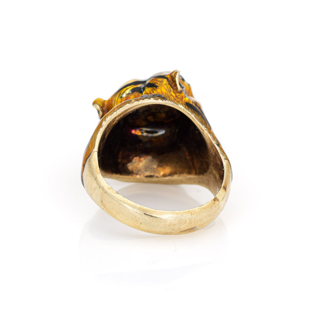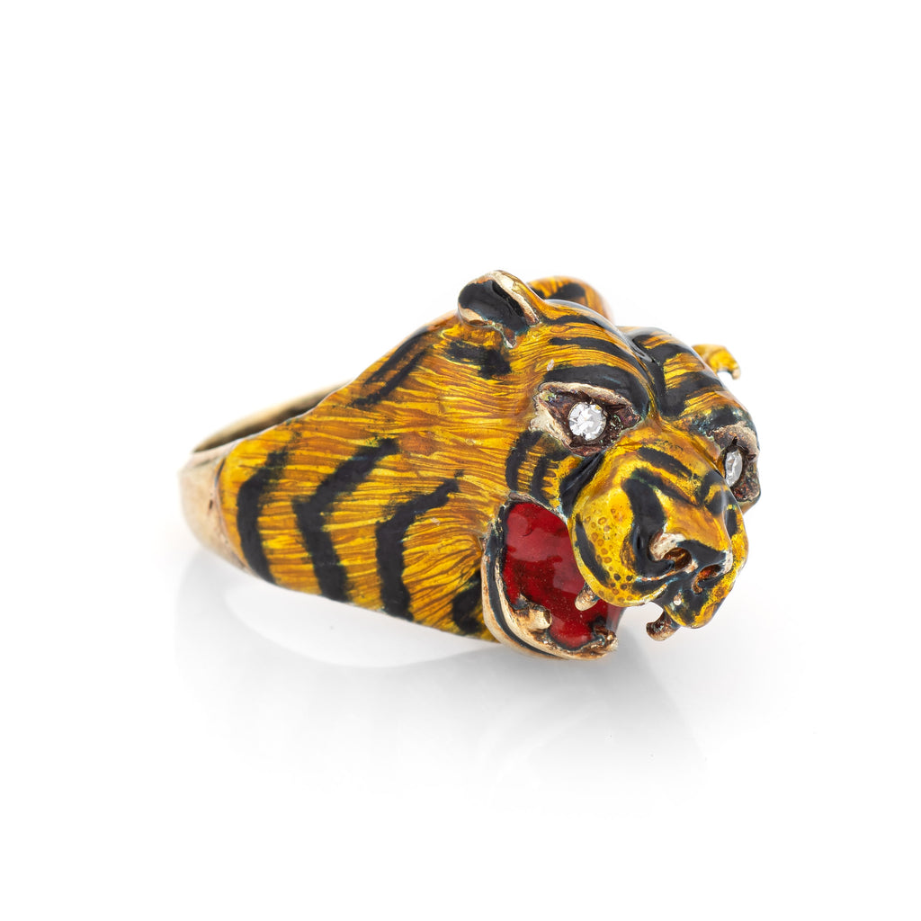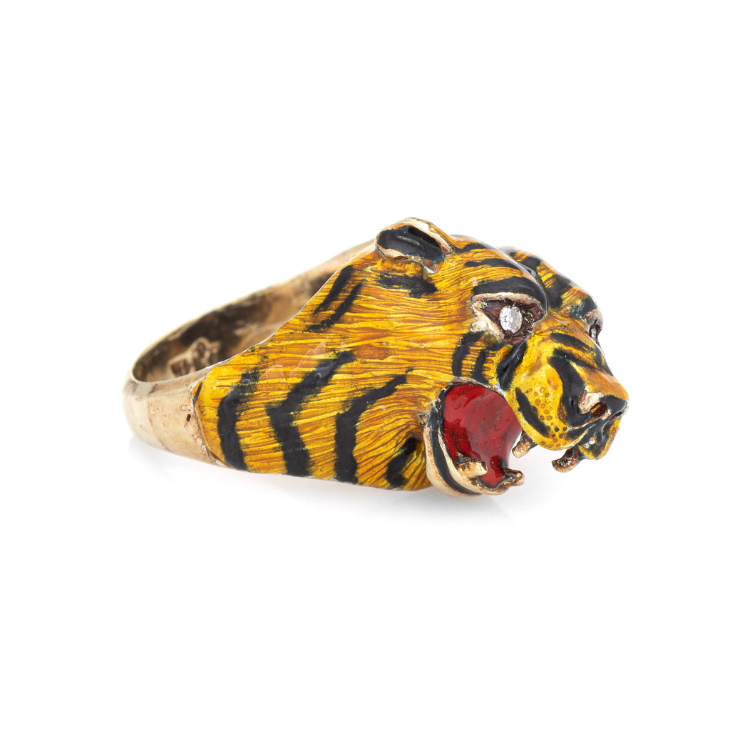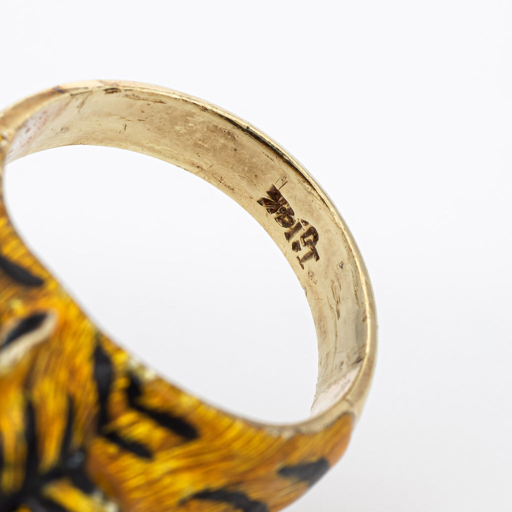 Distinct & unusual vintage enameled Bengal tiger ring (circa 1960s to 1970s) crafted in 14 karat yellow gold.