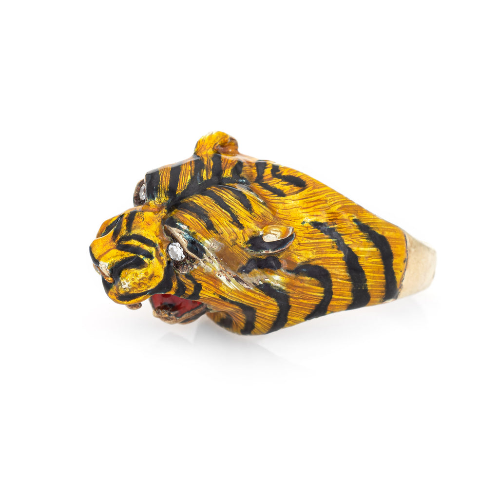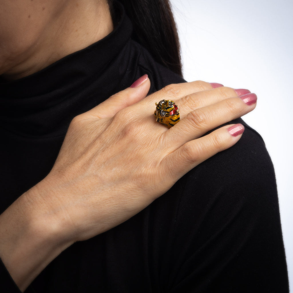 The beautifully crafted ring highlights a Bengal tiger with enamel rendered in vivid colors of yellow, red tongue and black stripes. Diamonds adorn the eyes. The cocktail ring makes a great statement on the hand. The high rise ring (16mm - 0.62 inches) sits comfortably on the finger.