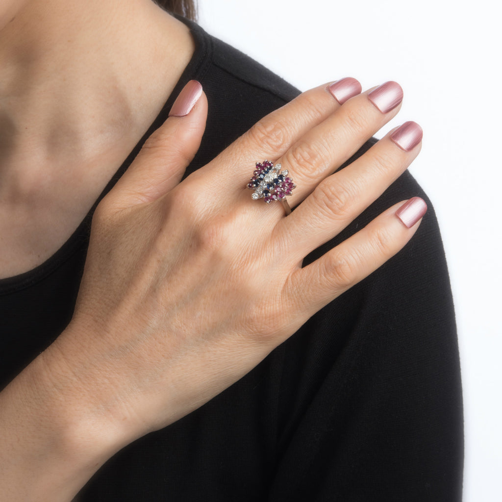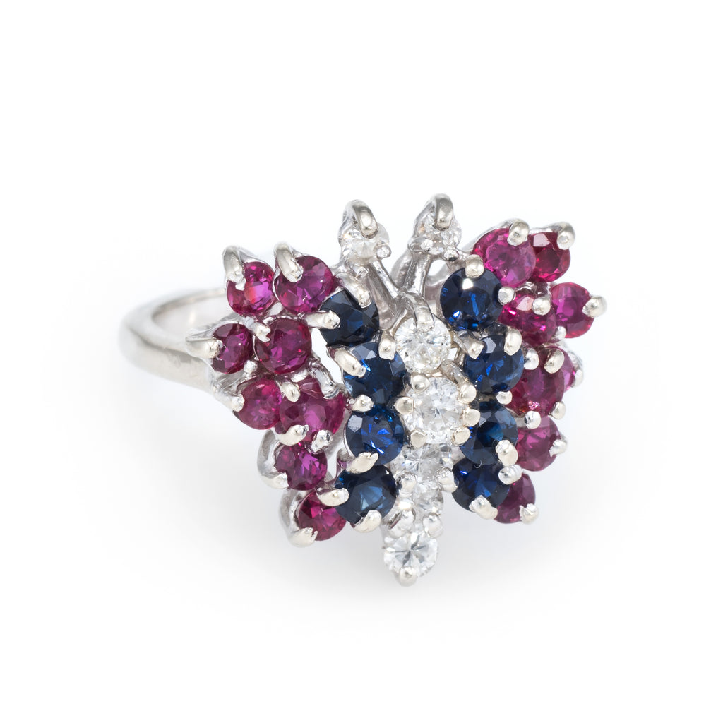 Stones: Round brilliant cut diamonds total an estimated 0.50 carats (estimated at I color and SI1-2 clarity), accented with an estimated 1 carat of rubies and 1/2 carats of sapphires. The gemstones are in excellent condition and free of cracks or chips.