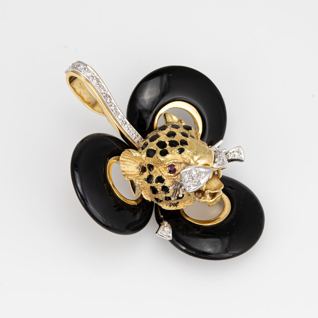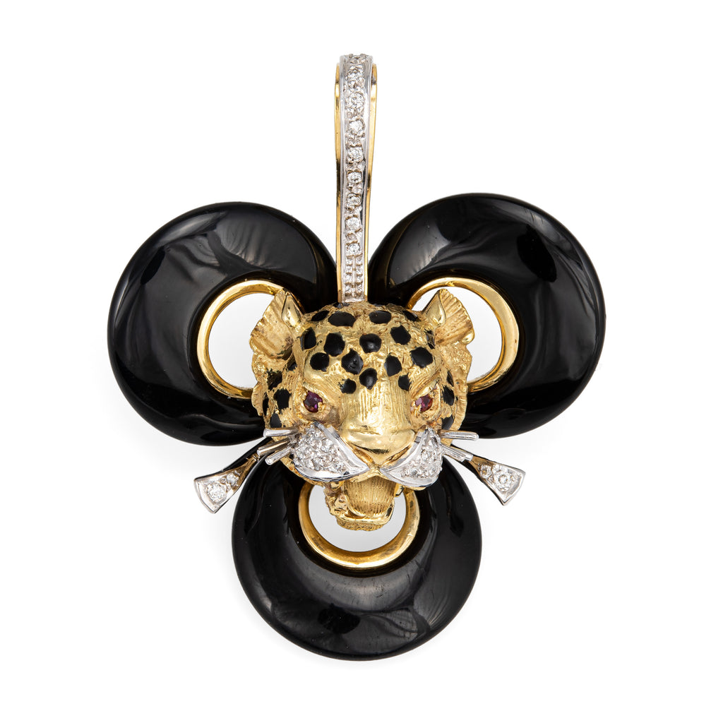 Stones: Diamonds total an estimated 0.38 carats (estimated at H-I color and VS2-SI1 clarity). Two rubies are set into the eyes (estimated at 0.02 carats each). Onyx frames the leopard, measuring 24mm wide.